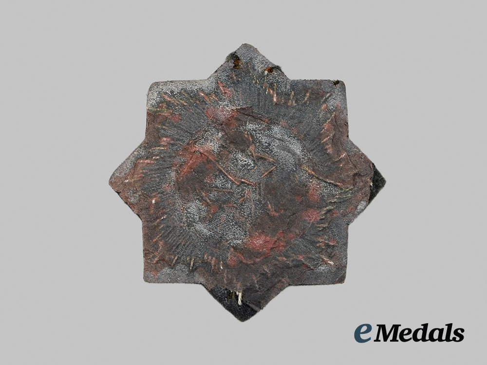 (Deutsches Kreuz in Gold, Stoffausführung). A cloth version of the German Cross in Gold, consisting of a double-overlaid eight-pointed starburst executed in field-grey wool with grey threaded and silver aluminum wire details, bearing a central white rayon disc overlaid by a black machine-embroidered mobile swastika trimmed with silver aluminum wire piping, situated within a circular gilt laurel leaf wreath, wrapped in ribbon and joined together at the bottom by a plaque bearing an institution date of “1941”, trimmed along both the interior and exterior edges with red threaded piping and with and culminating in an additional silver aluminum wire border at the outer edge, the reverse retaining an intact paper liner, unmarked, measuring 74 mm (w) x 74 mm (h), weighing 6.6 grams, in extremely fine condition.