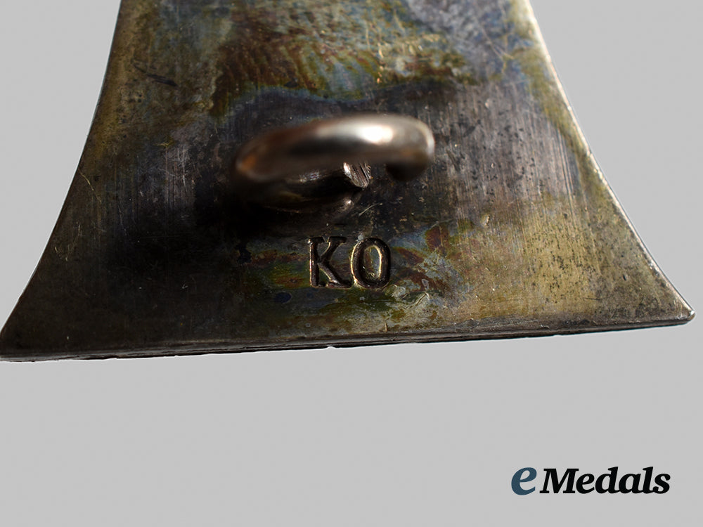 (Eisernes Kreuz 1914 I. Klasse). Reinstituted 5 August 1914 by Kaiser Wilhelm II. (1914-1918 issue). Constructed of iron and silver, consisting of a Cross Pattée with a blackened magnetic iron core within a ribbed silver frame, the obverse with a central initial “W”, the six o’clock arm with a reinstitution date of “1914”, the twelve o’clock arm with a royal crown, the reverse with a block hinge and vertical pinback meeting a round wire catch, maker marked “KO” for a widely-documented but unidentified manufacturer, measuring 43.10 mm (w) x 43.10 mm (h), weighing 15.8 grams, in demonstrating minor loss of finish to the core with evidence of polishing to the frame, in very fine condition.