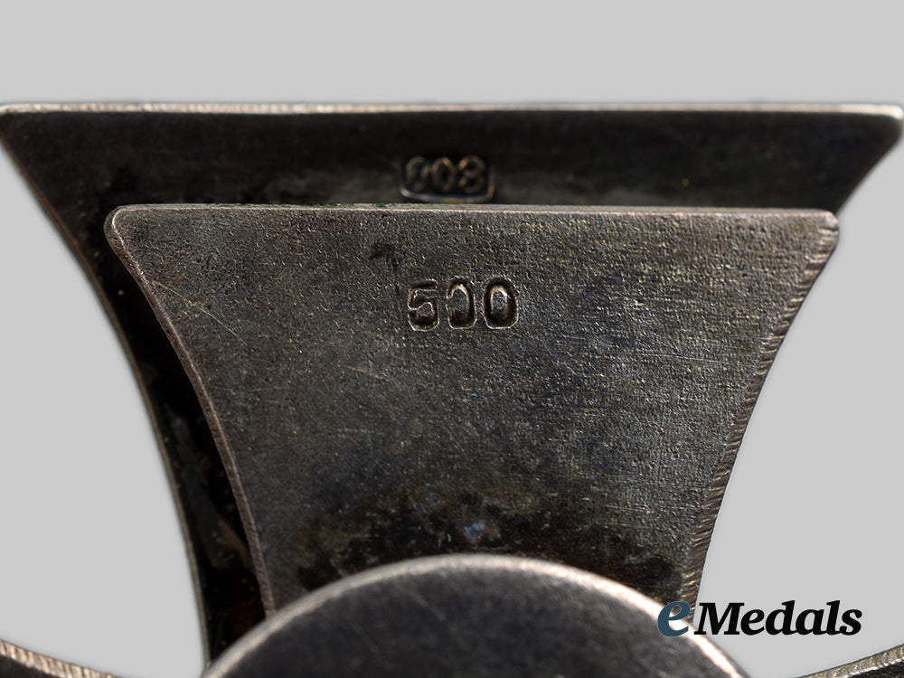 (Eisernes Kreuz 1914 I. Klasse). Reinstituted 5 August 1914 by Kaiser Wilhelm II. (1914-1918 issue). Constructed of iron and silver, consisting of a Cross Pattée with a blackened magnetic iron core within a ribbed silver frame, the obverse with a central initial “W”, the six o’clock arm with a reinstitution date of “1914”, the twelve o’clock arm with a royal crown, the reverse with a central threaded post retaining an original silver cruciform backplate and nut, the cross stamped with a silver content number of “800”, the backplate stamped with a silver content number of “500”, and the nut stamped with a silver content number of “800” in addition to a D.R.G.M registration number, measuring 42.51 mm (w) x 42.36 mm (h), weighing 22.5 grams (inclusive of hardware), demonstrating moderate loss of finish and surface oxidation throughout the core, in very fine condition.