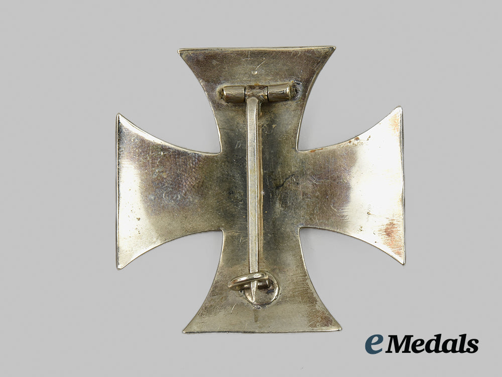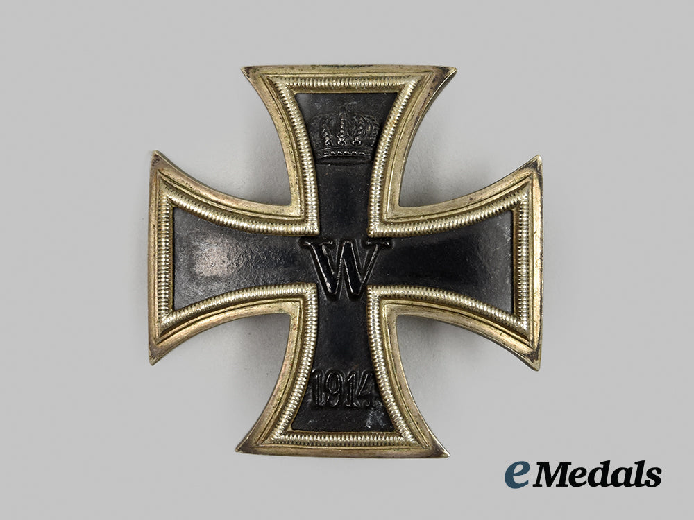 (Eisernes Kreuz 1914 I. Klasse). Reinstituted 5 August 1914 by Kaiser Wilhelm II. (1914-1918 issue). Constructed of iron and silver, consisting of a vaulted Cross Pattée with a blackened magnetic iron core within a ribbed silver frame, the obverse with a central initial “W”, the six o’clock arm with a reinstitution date of “1914”, the twelve o’clock arm with a royal crown, the reverse with a barrel hinge and vertical pinback meeting a round wire catch, unmarked, measuring 42.86 mm (w) x 42.65 mm (h), weighing 13.9 grams, a privately purchased example in extremely fine condition.
