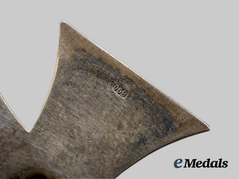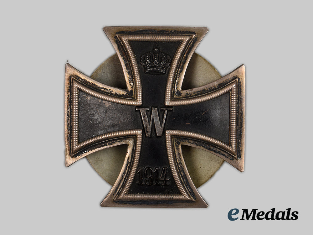 (Eisernes Kreuz 1914 I. Klasse). Reinstituted 5 August 1914 by Kaiser Wilhelm II. (1914-1918 issue). Constructed of iron and silver, consisting of a vaulted Cross Pattée with a blackened magnetic iron core within a ribbed silver frame, the obverse with a central initial “W”, the six o’clock arm with a reinstitution date of “1914”, the twelve o’clock arm with a royal crown, the reverse with a central threaded post retaining both its original backplate and nut with serrated edge, the six o’clock arm stamped with a silver content number of “800”, measuring 42.95 mm (w) x 43.06 mm (h), weighing 19.9 grams (inclusive of hardware), demonstrating minor loss of finish to the core, a privately purchased example produced c. 1935 in near extremely fine condition.