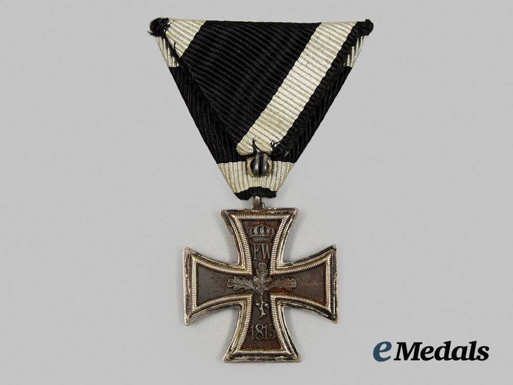 (Eisernes Kreuz 1914 II. Klasse, Prinzengröße). Reinstituted 5 August 1914 by Kaiser Wilhelm II. (1914-1918 issue). Constructed of iron and silver, on loop for suspension from its period original tri-fold ribbon, consisting of a Cross Pattée with a blackened magnetic iron core within a ribbed silver frame, the obverse with a central initial “W”, the six o’clock arm with a reinstitution date of “1914”, the twelve o’clock arm with a royal crown, the reverse with three oak leaves, the six o’clock arm with an initial institution date of “1813”, the twelve o’clock arm with initials “FW” topped by a royal crown, unmarked, measuring 35.01 mm (w) x 40.59 mm (h), weighing 8.6 grams, a scarce example in extremely fine condition.