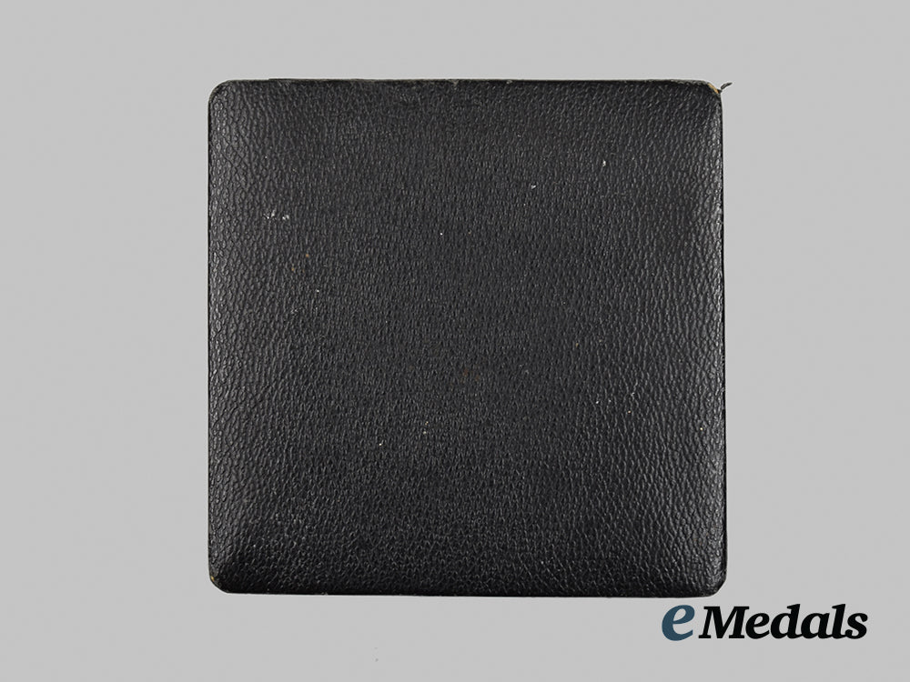 (Deutsches Kreuz in Gold mit Etui). Constructed of cupal with gilt and multi-coloured enamels, the obverse consisting of a double-overlaid eight-pointed starburst pattern, bearing a central silvered disc overlaid by a raised and black enameled mobile swastika, situated within a circular gilded laurel leaf wreath, wrapped in ribbon and joined together at the bottom by a plaque bearing an institution date of “1941”, trimmed along both the interior and exterior edges with red enameled rings, the reverse with four visible rivets securing the obverse applique in place, with a barrel hinge and tapering vertical pinback meeting a flat wire catch, the pinback maker marked with Präsidialkanzlei code “1” for Deschler & Sohn, Munich, measuring 63.66 mm (w) x 63.50 mm (h), weighing 53.2 grams, accompanied by its original presentation case, constructed of a wooden frame with a faux black leather exterior liner, the interior with a white rayon lid liner and intact hinge cover, with a slotted black velvet medal bed, closing with a functional metal spring catch with exterior stud release, unmarked, measuring 110 mm (w) x 110 mm (l) x 30 mm (h), the enamel of the swastika demonstrates shallow scratches and loss of finish consistent with friction, a fine-quality example in overall extremely fine condition, accompanied by a comprehensive certificate of authenticity issued by Dietrich Maerz, dated 30 October 2023.