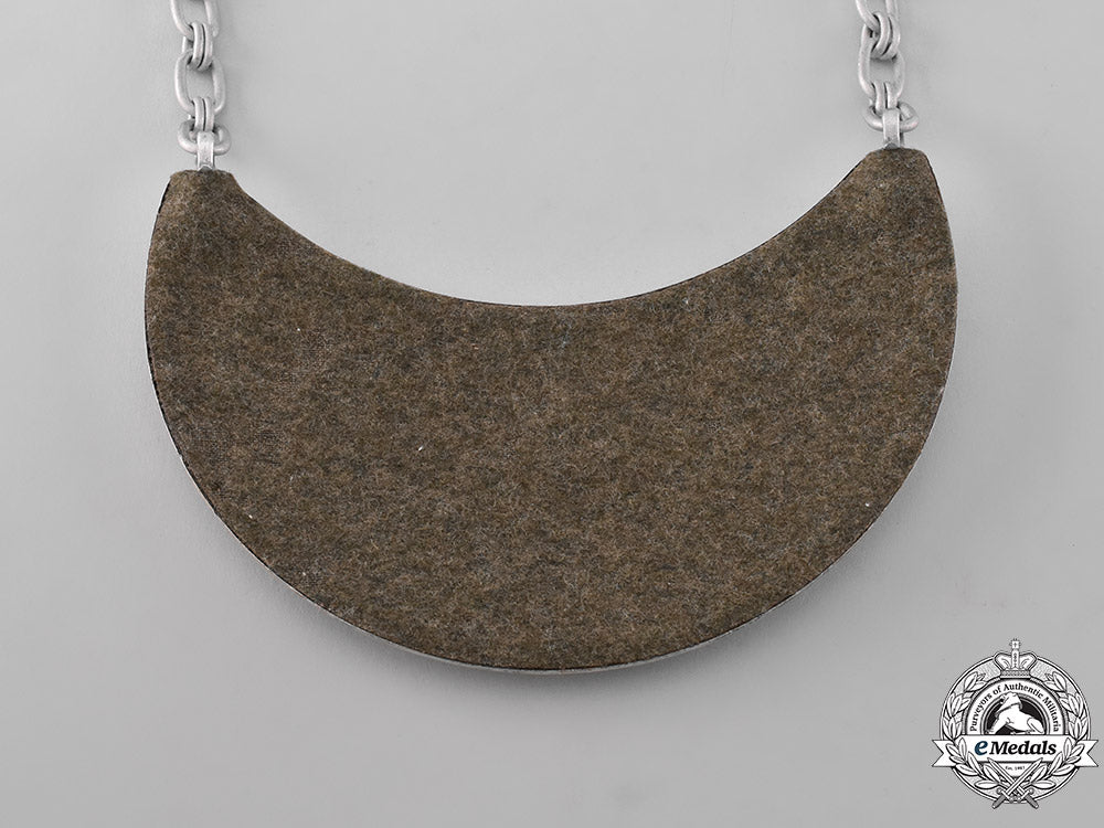 (Gorget). A half-moon gorget constructed of brightly polished aluminum with a raised perimeter rim, the obverse centre presents a stamped centre-piece consisting of the RAD shovel encircled by wheat sheaves and superimposed on a mobile swastika, above the emblem is a furled banner bearing the title STREIFENDIENST (PATROL DUTY), the reverse presents an olive-drab wool backing, the gorget is suspended from an aluminum chain consisting of interconnected single oval and smaller double oval links in a dull finish, measuring 180 mm (w) x 90 mm, and near mint.