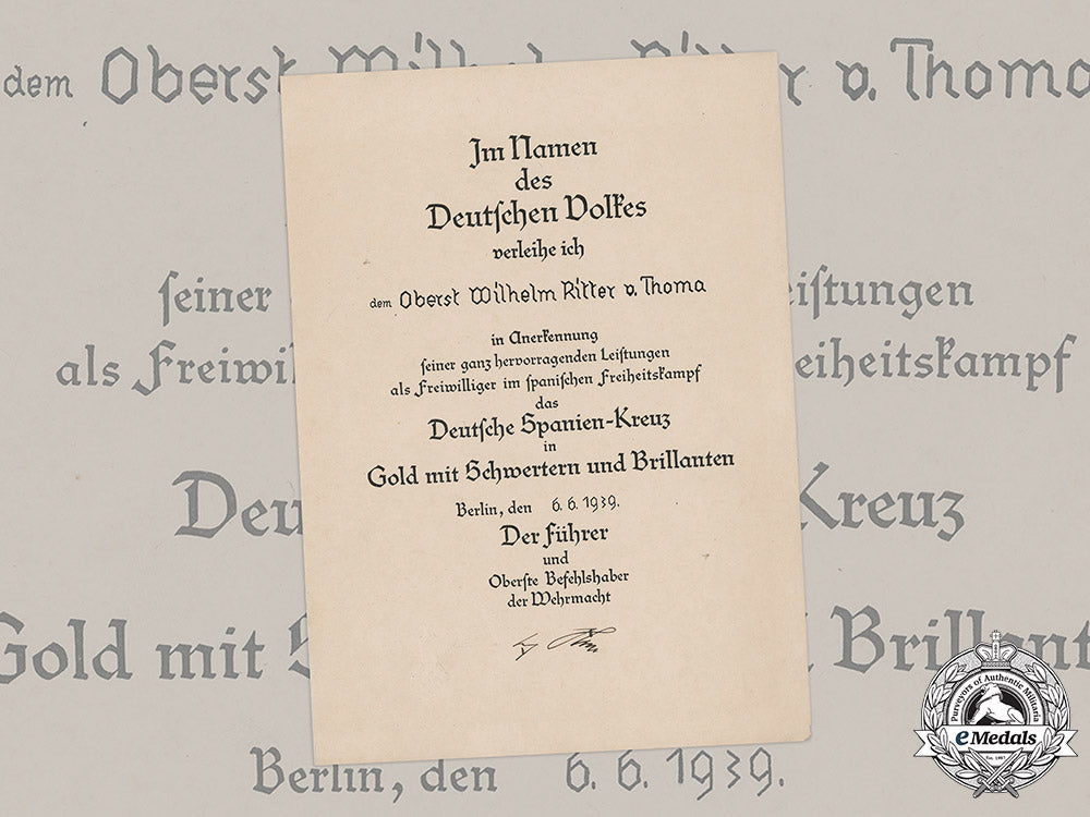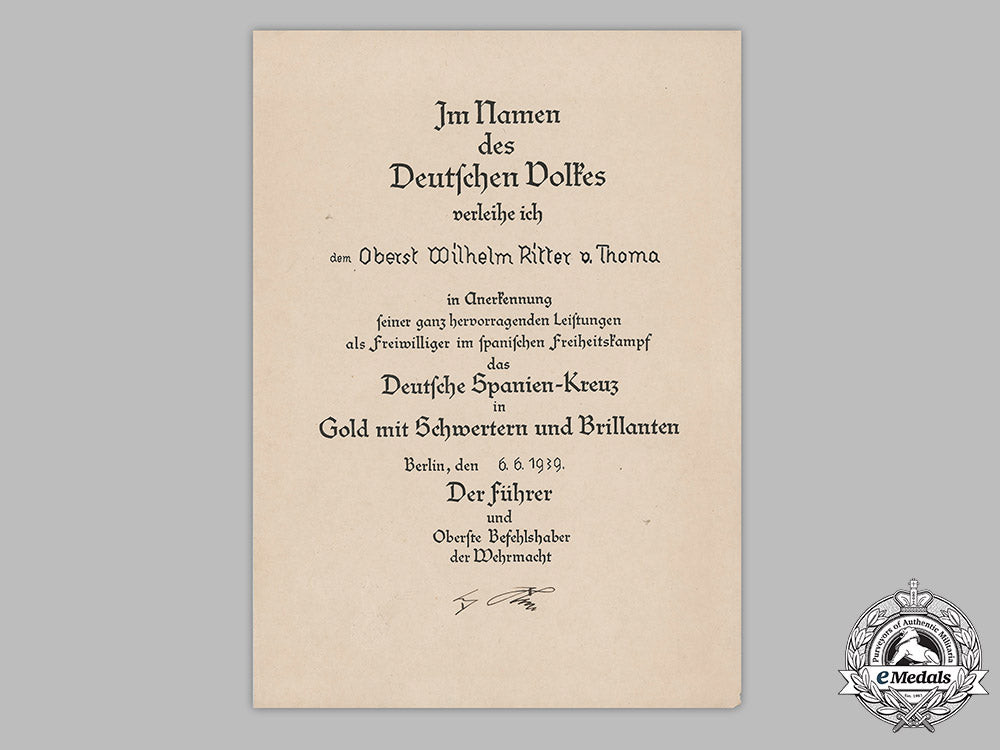 The document is named to Oberst (Colonel) Wilhelm Ritter von Thoma, “for recognition of his especially outstanding achievements as a volunteer in the Spanish Fight of Liberation”. It is dated to Berlin on June 6, 1939 and signed in black ink by A. Hitler. Measuring 254mm (w) x 355mm (h), with minimal scuffing of the edges and light fraying of the bottom right corner, remaining extremely fine. The Spanish Cross in Gold with Swords & Diamonds was awarded only 28 times. An extremely rare and highly important award document.