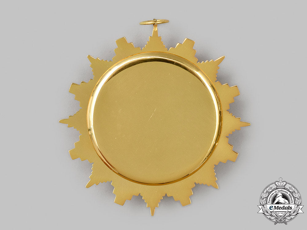 The Collar Badge of the order presents a silver gilt and white enamel decoration, a large gilt disk with small rays alternating between emanating rays and squared pyramids, the obverse medallion features a left facing profile of Sheikh surrounded by a white enamelled frame with gilt wreath and eight small pearls, the disk is inscribed in Arabic meaning “Order of Sheikh Issa bin Salman Al Khalifa Bahrain” from 8 o’clock to 4 o’clock contained at each end with a slightly larger pearl, surmounted by a suspension ring at 12 o’clock, the reverse is plain, measures 79.5mm (w) x 82.1mm (h – inclusive of integral ring), weighs 105.4 grams, enamels intact, an extremely rare and mint condition badge.