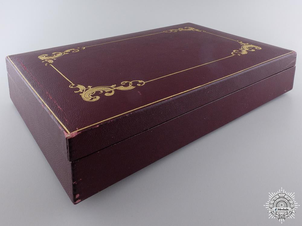 Contained in a privately made case, the exterior presenting a red leatherette case with golden detailing on the lid, the interior presents a crème-coloured silk lid with removable silk pillow in the base, measures 192mm (length) x 125mm (width) x 44mm (depth), light wear to corners and edges, in overall very fine condition.
