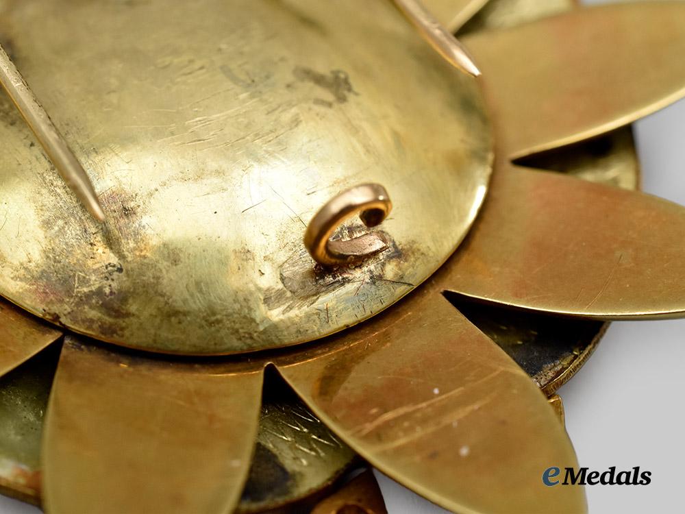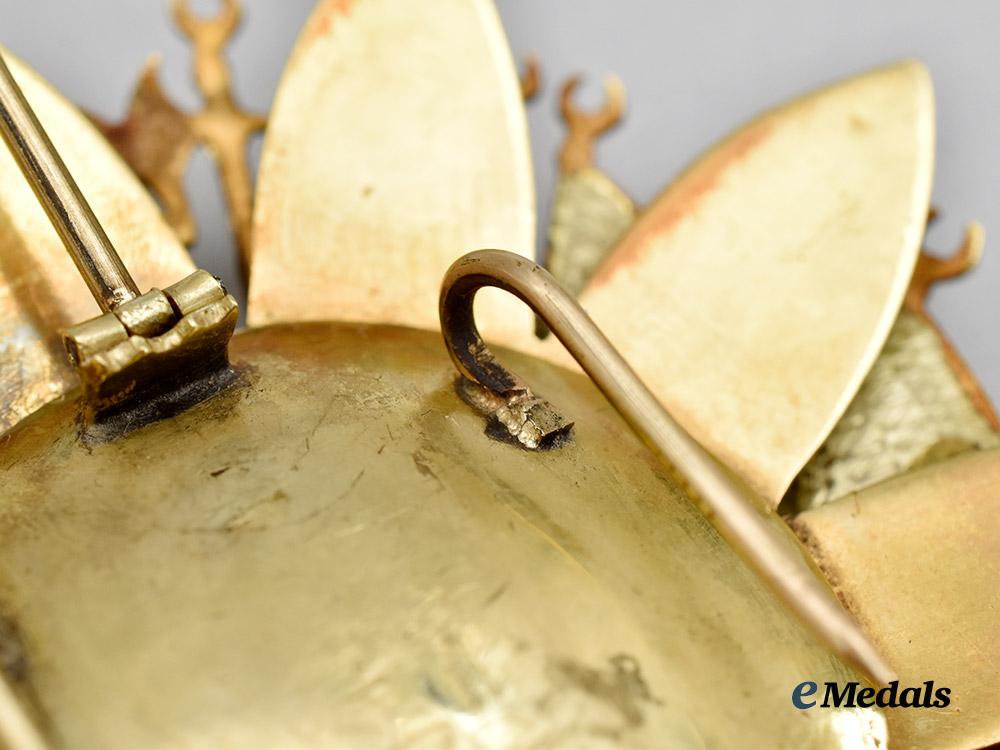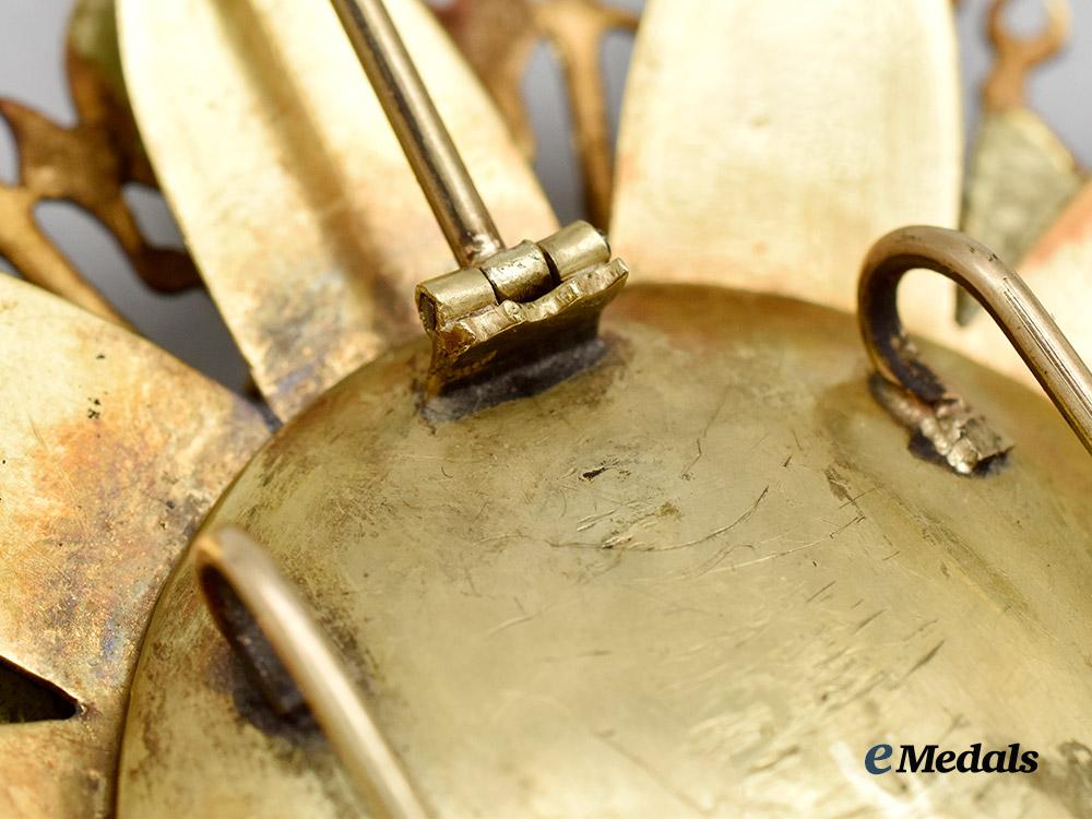 (Order of the Fundamental Pact). Instituted January 16 1860. A beautiful and extremely rare breast star of this single class order, from the reign of M’hamed el Hedi Bey (1902-1906). In 22 karat Gold (tested), this star presents an artisan made circular obverse plate in red enamels with crescent moon pattern on flowing flag ribbons, a ring of approximately 3.0 carats of genuine emeralds encircle the raised cipher of Beys with cut emeralds in the center (one emerald chip missing), superimposed on a jeweller-made ten armed green enamel star, the reverse presents a vertical pin flanked by dual stays, the star measures 71.39mm (w) x 78.39mm (h), weighs 104.47 grams, enamels flaking specifically in the green rays and green flag at 12 o’clock, the plate and star likely period affixed as the plate is slightly off center, wear consistent with age, hinge and catch functional, a truly lovely star of this very rare order.
