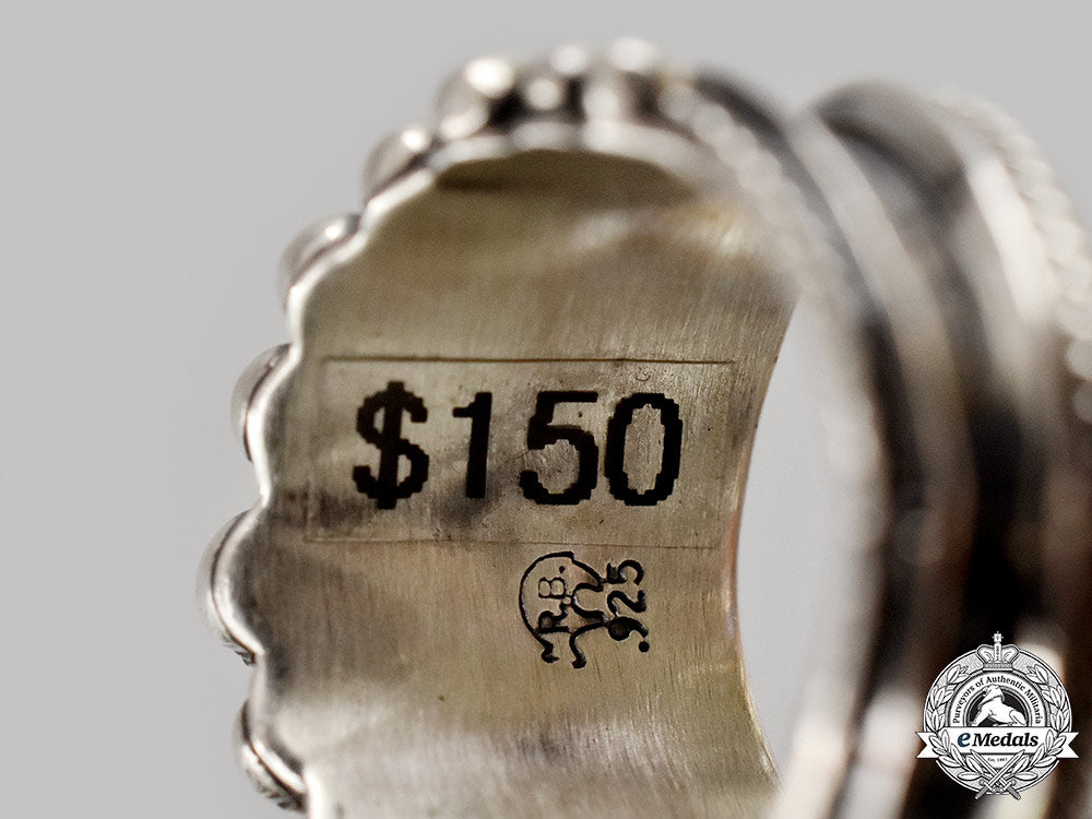(Jewellery, Ring). Modern. A silver ring by Raymond Delgarito. The ring features a central berry and leaf design with a graduated pearled border on one side and a simulated twisted rope border on the other side. The interior of the band is marked “R.B.” within a bear outline and “925”. The ring is sized at a 7 ¾ and weighs 8.6 grams. In extremely fine condition.