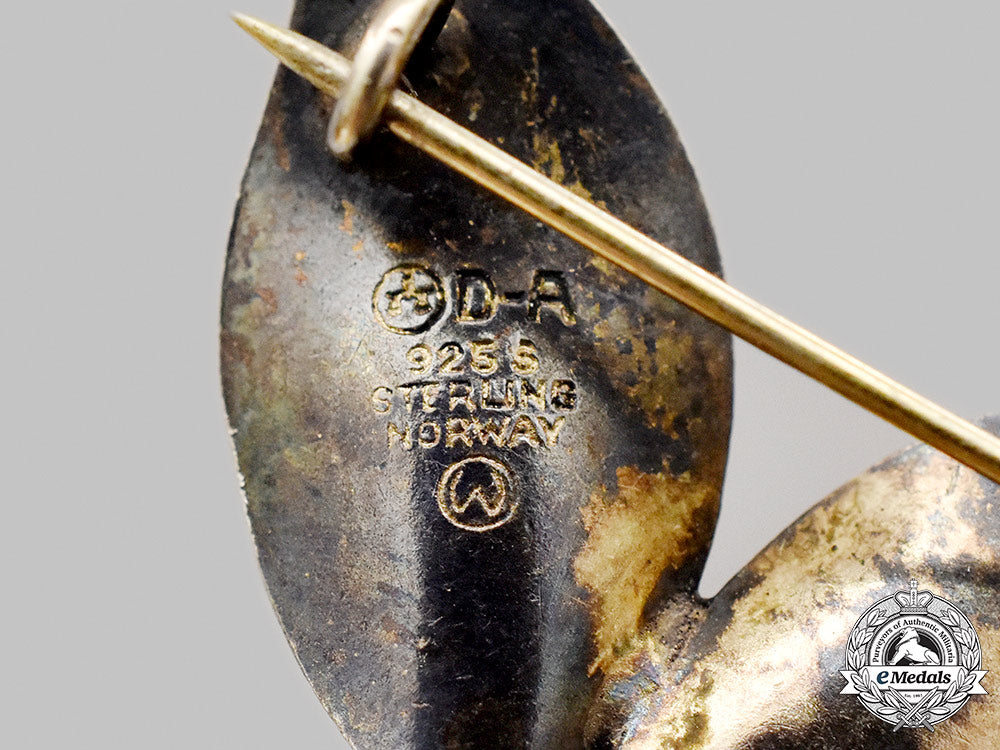 (Jewellery, Brooches). Vintage. A silver brooch with yellow enamels in the shape of two leaves by David Andersen. The reverse bears a horizontal pin with a round wire catch. The reverse is marked “D-A”, “925 S”, “STERLING NORWAY”, “W”.. The brooch was produced c. 1955. Measuring 37.80mm (w) x 26.37mm (h) and weighing 4.5 grams. In extremely fine condition.