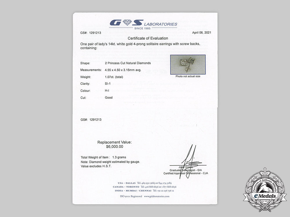 This item is accompanied by a Certificate of Authenticity by GS Laboratories. GemScan is the largest and most prominent diamond grading and jewelry grading laboratory in Canada. Offices are also located in Texas and India. The appraisal states a $6,000 CAD suggested insurance coverage.