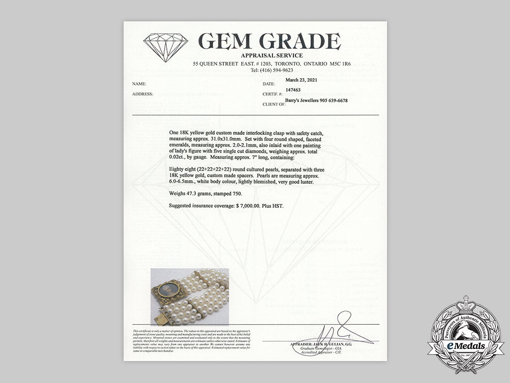 This item is accompanied by a Certificate of Authenticity from Gem Grade Appraisal Service. Gem Grade is a renowned Toronto based appraisal service, with GIA graduate gemologist, in business for over 20 years.The appraisal states a $7,000 CAD suggested insurance coverage.
