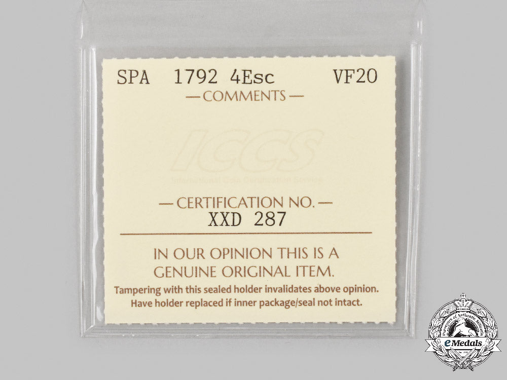 (Currency, Coins). Antique. A circular coin constructed of 21kt yellow gold. The obverse features the bust of Carlos IV, encompassed by the inscription “CAROL • IIII • D • G • HISP • ET IND • R • 1791• “. The reverse features a crowned coat of arms within the collar of the Order of the Golden Fleece, encompassed by the inscription “•IN • UTROQ • FELIX • AUSPICE • DEO • 4 S M• •MF”. The edge is center slanting reeded to the left. Measuring 28.95mm in diameter and weighing 13 grams. With a gouge, this coin has been graded VF20 by ICCS (International Coin Certification Service).