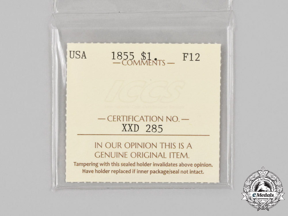 (Currency, Coins). Antique. A circular coin constructed of 21kt yellow gold. The obverse bears the image of Liberty with an indigenous headdress, encompassed by the inscription “UNITED STATES OF AMERICA”. The reverse features the inscription “1 DOLLAR 1855” encompassed by a wreath tied with a ribbon in a bow at the bottom. The edge of the coin is reeded. Measuring 15.08mm in diameter. This coin has been graded F12 by ICCS (International Coin Certification Service).