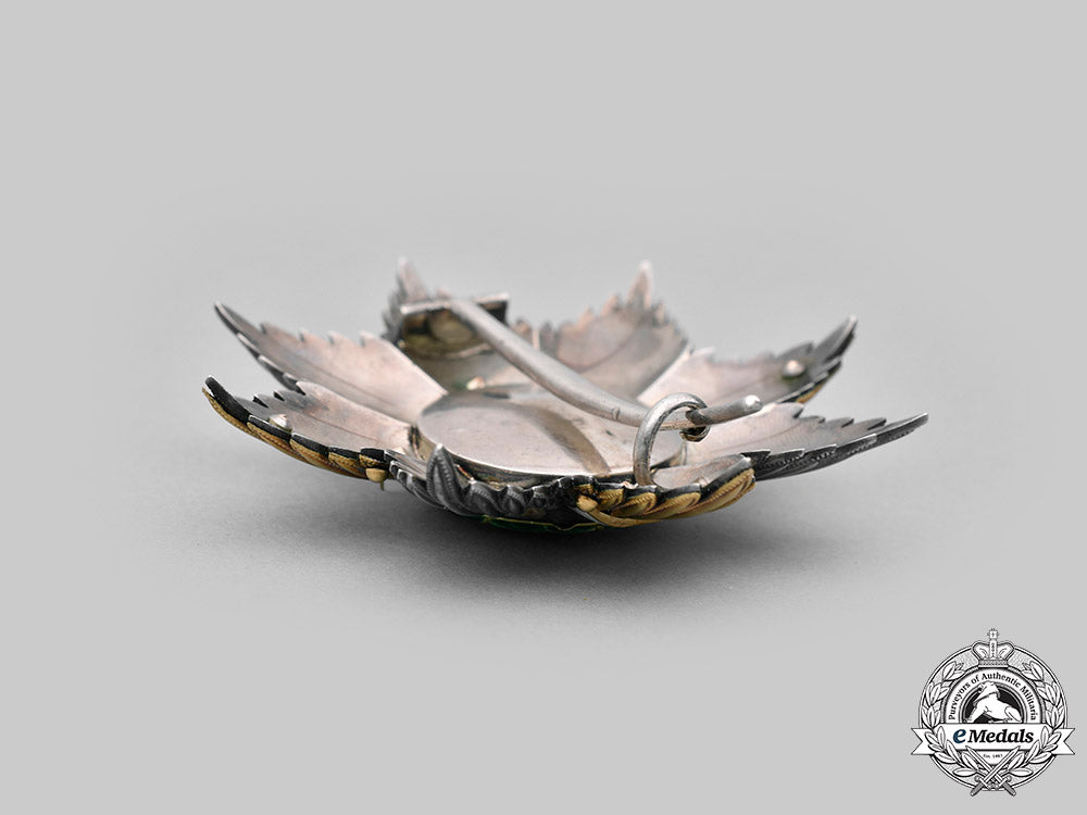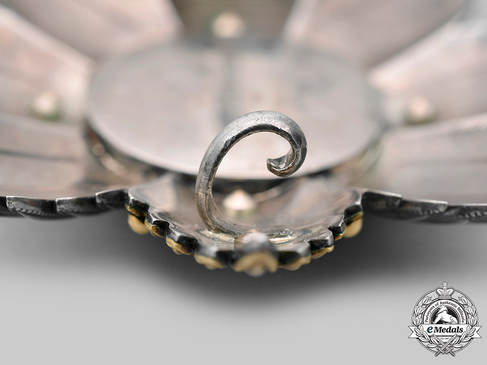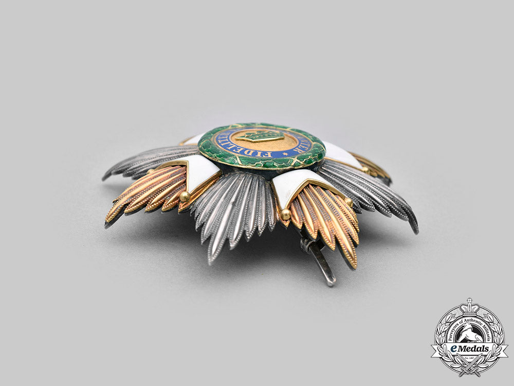 (Sachsen-Ernestinischer Hausorden, Bruststern zum Großskreuz). Instituted 25 December 1833 by Duke Friedrich of Saxe-Altenburg, Duke Ernst I of Saxe-Coburg-Gotha, and Duke Bernhard II of Saxe-Meiningen. (1833-1935 issue). Constructed of silver and Gold with multi-coloured enamels, the obverse consisting of an eight-pointed radiant starburst with gilded arms at the three, six, nine, and twelve o’clock points, overlaid by a central Maltese Cross with white enameled arms and ball finials, the cross with a central Gold medallion bearing a green enameled crown, within a ring of blue enamel bearing a gilt inscription of “FIDELITER ET CONSTANTER” (“FAITHFUL AND STEADFAST”), in turn within a green enameled laurel wreath, the reverse with right visible rivets securing the obverse features in place, with a raised barrel hinge and narrow banjo-style pinback meeting a rounded catch, unmarked but with the physical characteristics of manufacturer by J. Godet, Berlin, measuring 83.12 mm (w) x 83.65 mm (h), weighing 66.2 grams, an exceptional piece in overall extremely fine condition.