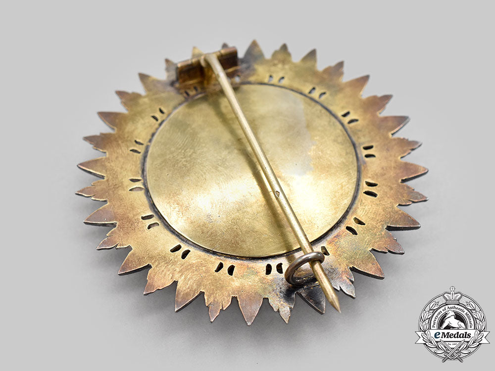 Accompanied by the breast star in silver, the center medallion featuring a white enamelled elephant on a rich blue enamelled field with a Thai Crown and Thai characteristics, surrounded by multiple red enamelled rays, the reverse presents a thin single pin vertical suspension, to indecipherable marks on the pin and one on the catch, measure 69.3mm (w) x 69.4mm (h), weighs 64.5 grams, dark patina on the silver, enamels show minimal wear, center intact, in extremely fine condition.