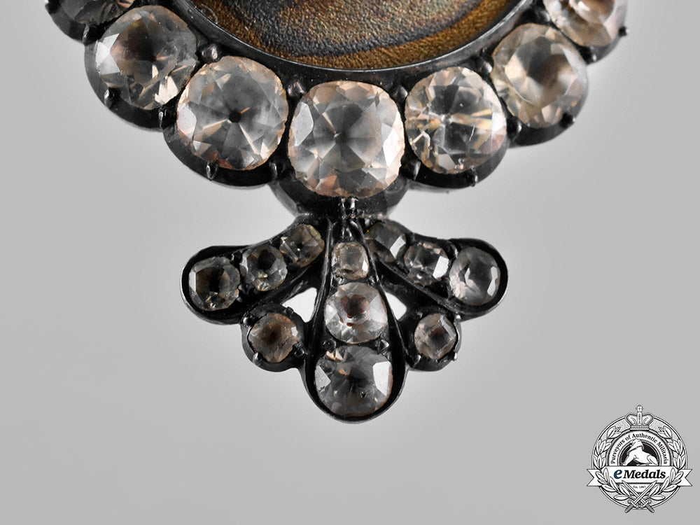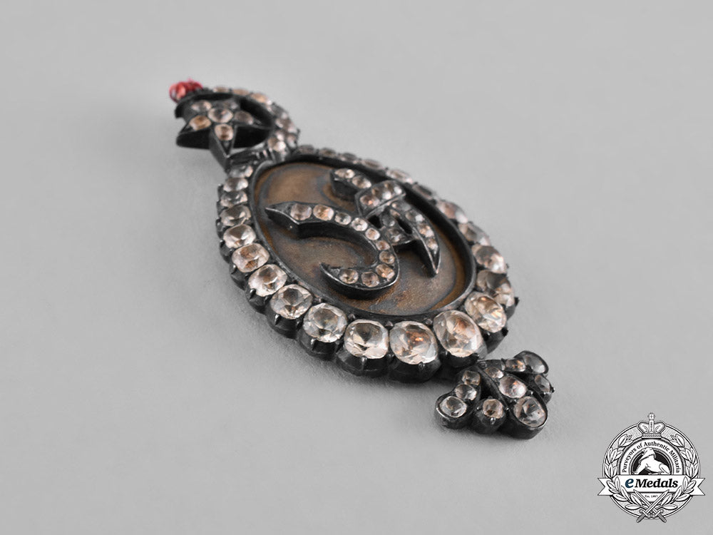 (Nishan al-Iftikhar). Type II (1843-1857). Muslim issue. Founded by Mustafa Pasha-Bey in 1835. Badge in silver gilt, a special Class breast badge consisting of 23 rose-cut glass, surrounding a central protrude cypher of Ahmad Pasha-Bey composed of 21 old cut/rose cut glass, surmounting by the symbol of the Star and Quarter Moon also in old cut/rose cut glass, with encrusted old cut/rose cut glass shaping leaves on the bottom, plain reverse, measuring 30.21 mm (w) x 58.05 mm (h), presenting toned silver and wearing contact on the reverse, missing its loop suspension, accompanied by original breast ribbon, very fine.