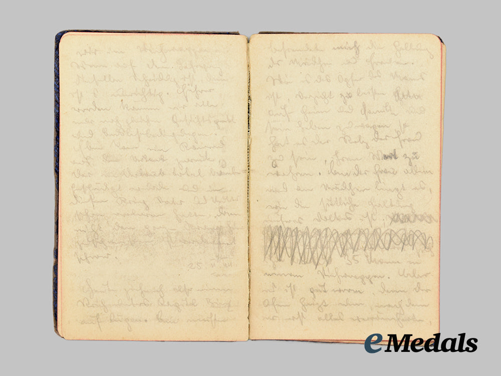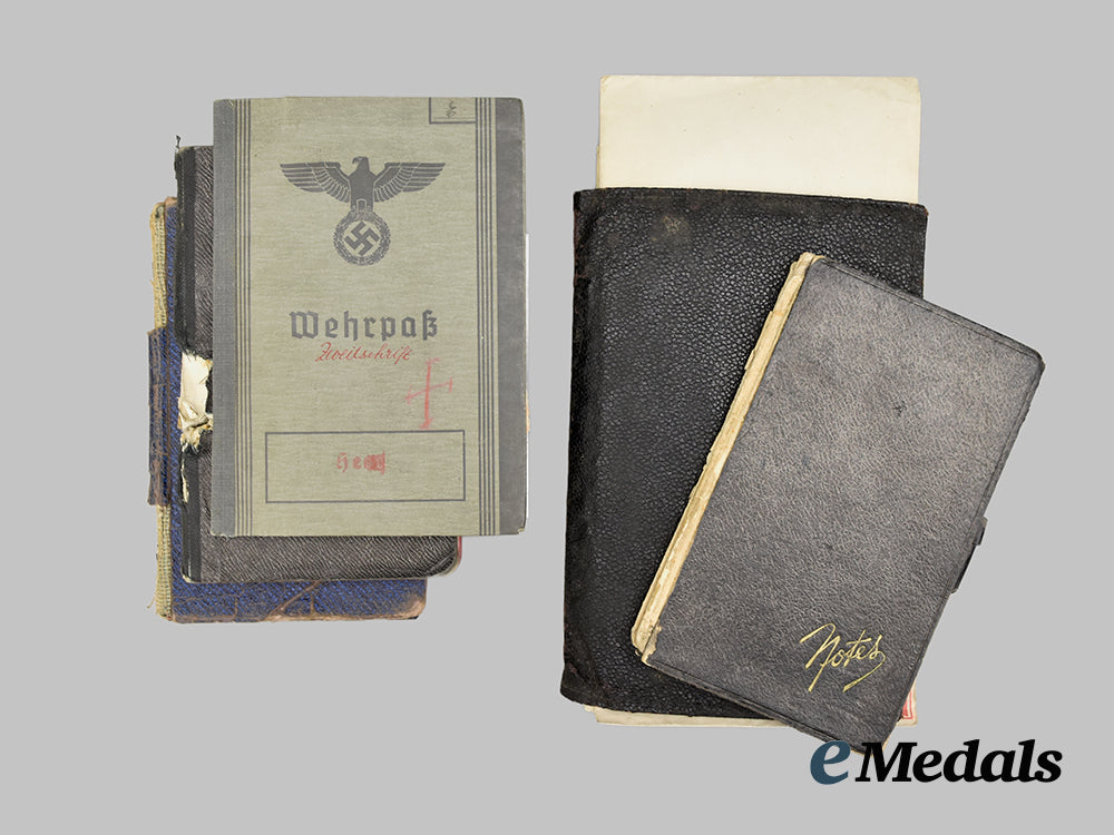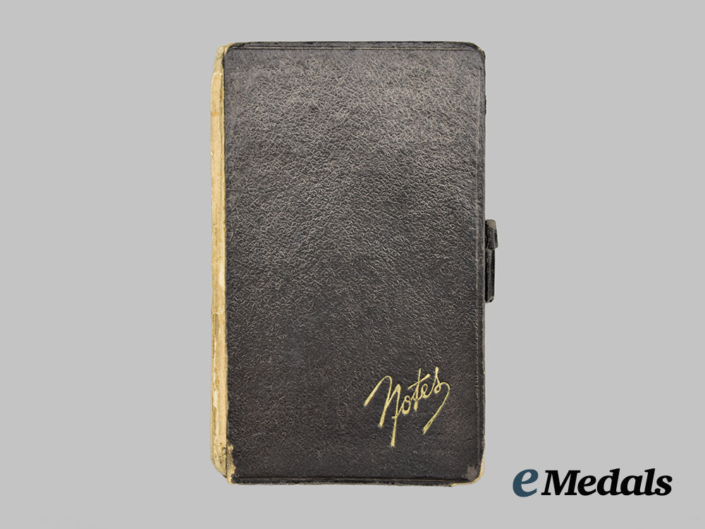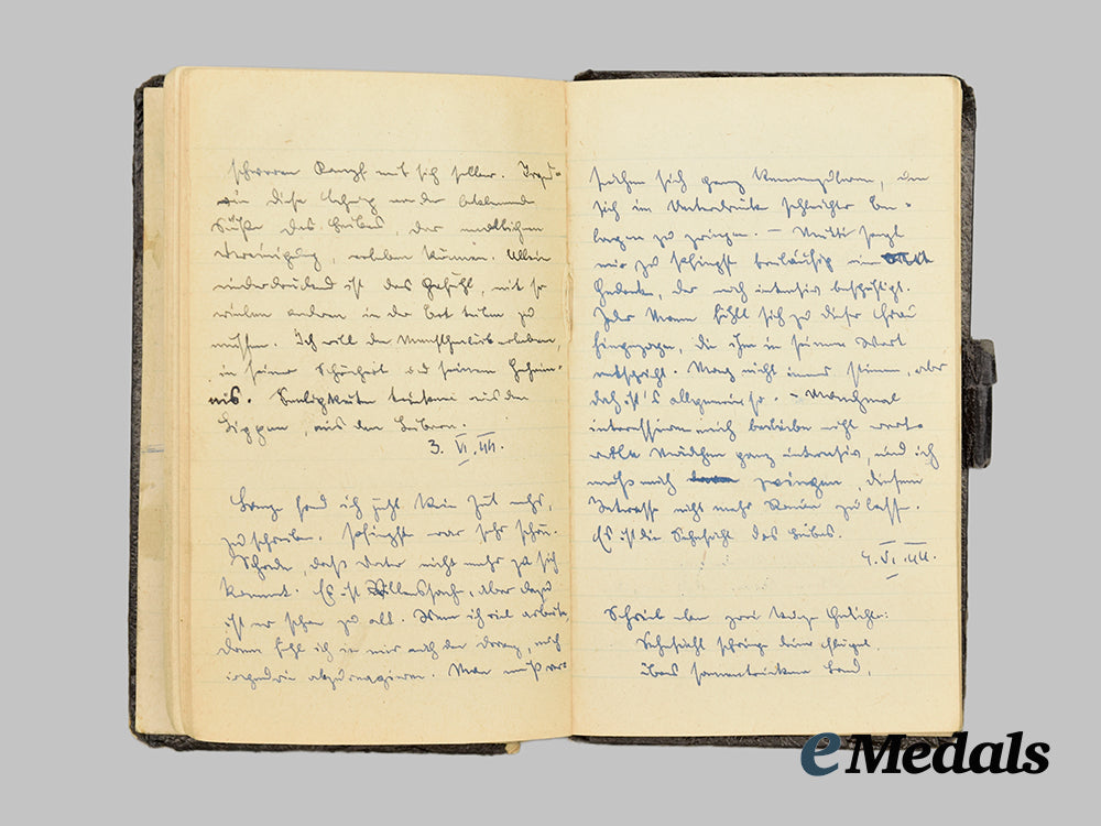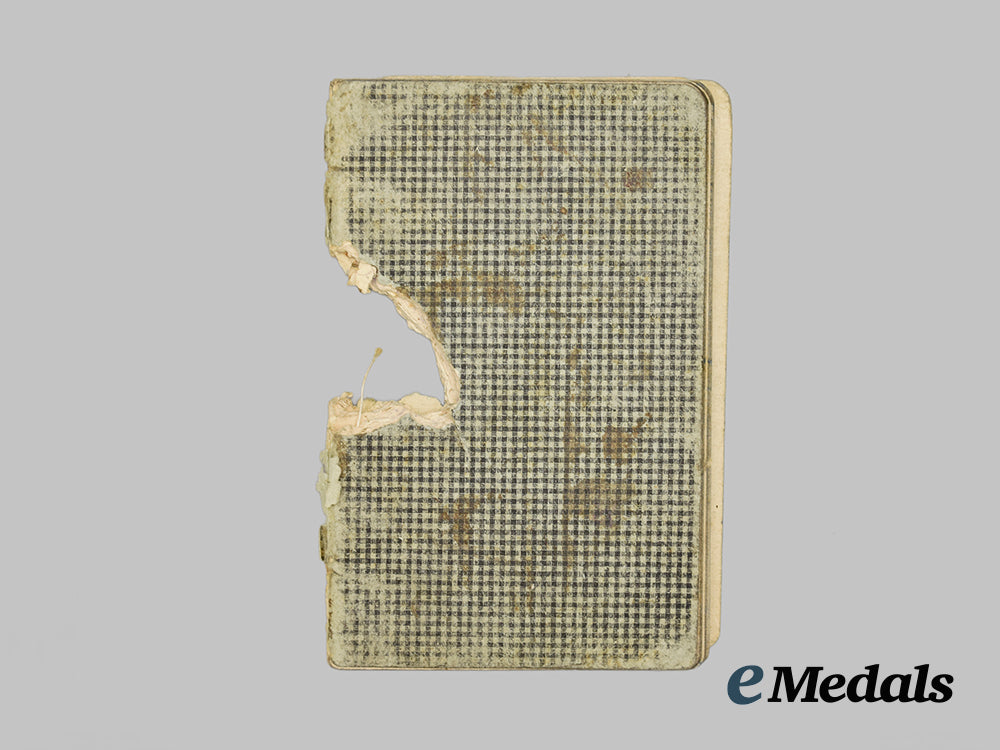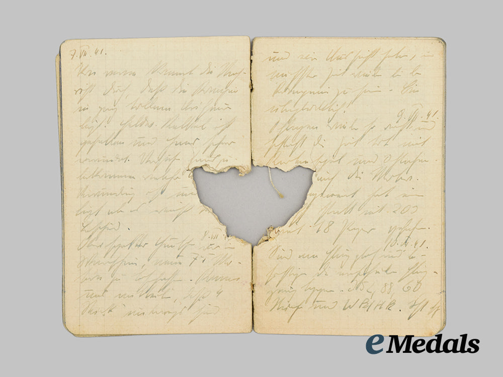 This grouping contains five diary notebooks that belonged to Hans, all filled from beginning to end, except for one, with his last entry three days before his death on September 27th, 1941, measuring 150 mm (w) x 88 mm (l). The books depict substantial damage, possibly from a bullet.