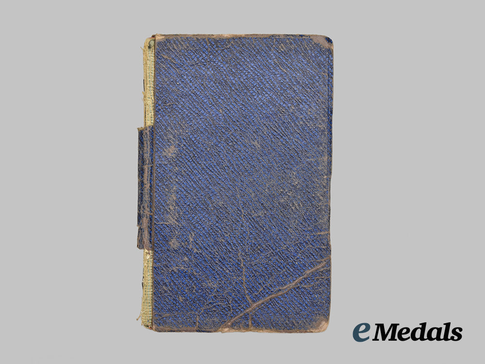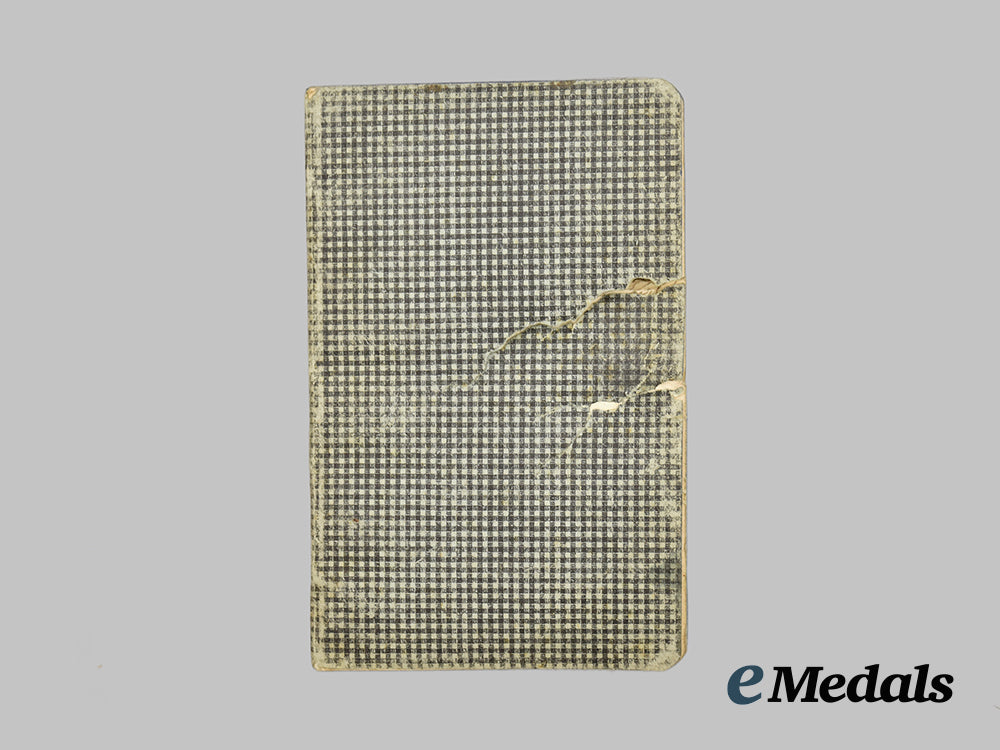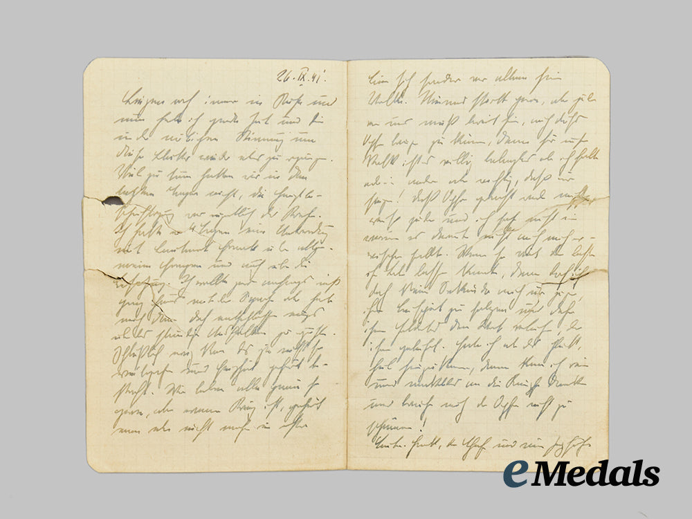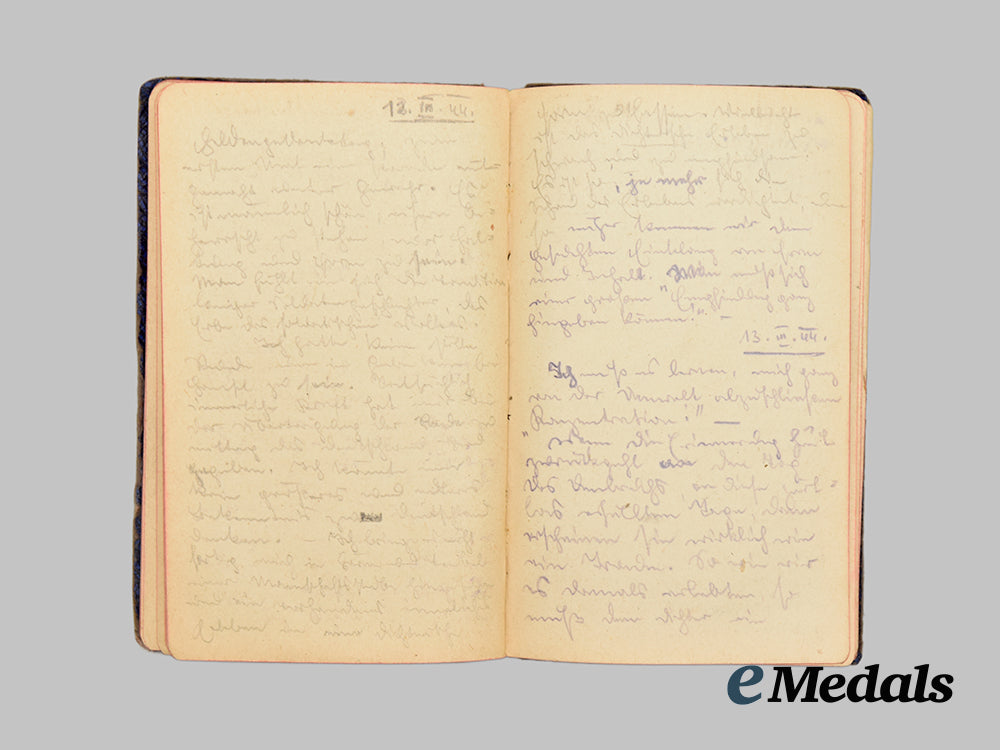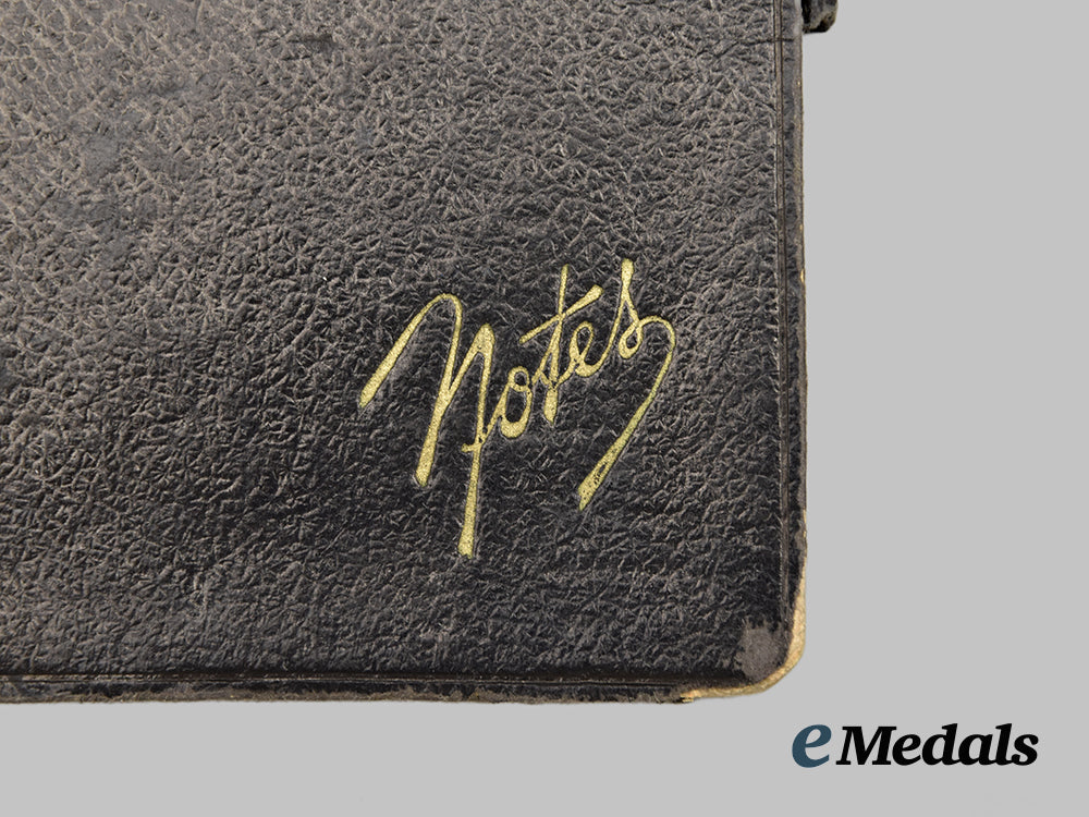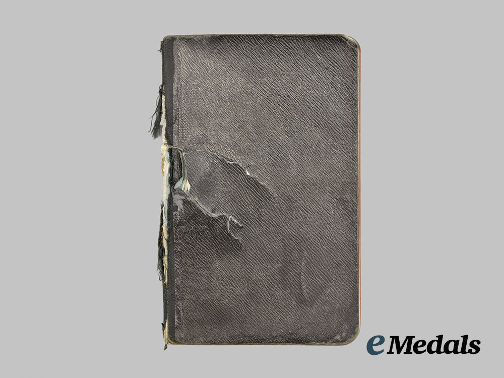 This grouping contains five diary notebooks that belonged to Hans, all filled from beginning to end, except for one, with his last entry three days before his death on September 27th, 1941, measuring 150 mm (w) x 88 mm (l). The books depict substantial damage, possibly from a bullet.