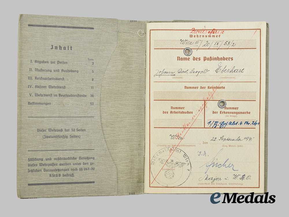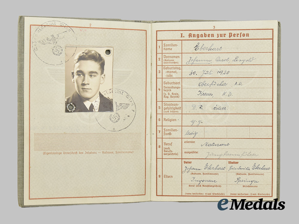 According to the included Wehrpaß, Johann “Hans” Eberhart was born on July 30th, 1920 in Oberfucha, Austria, measuring 106 mm (w) x 148 mm (l). He joined the HJ in 1932 and was a recipient of the Golden Honour Badge, according to the accompanying award certificate, measuring 88 mm (w) x 120 mm (l). There is also a picture of Hans in his HJ uniform, wearing his goldenes Ehrenabzeichen, measuring 58 mm (w) x 84 mm (l).