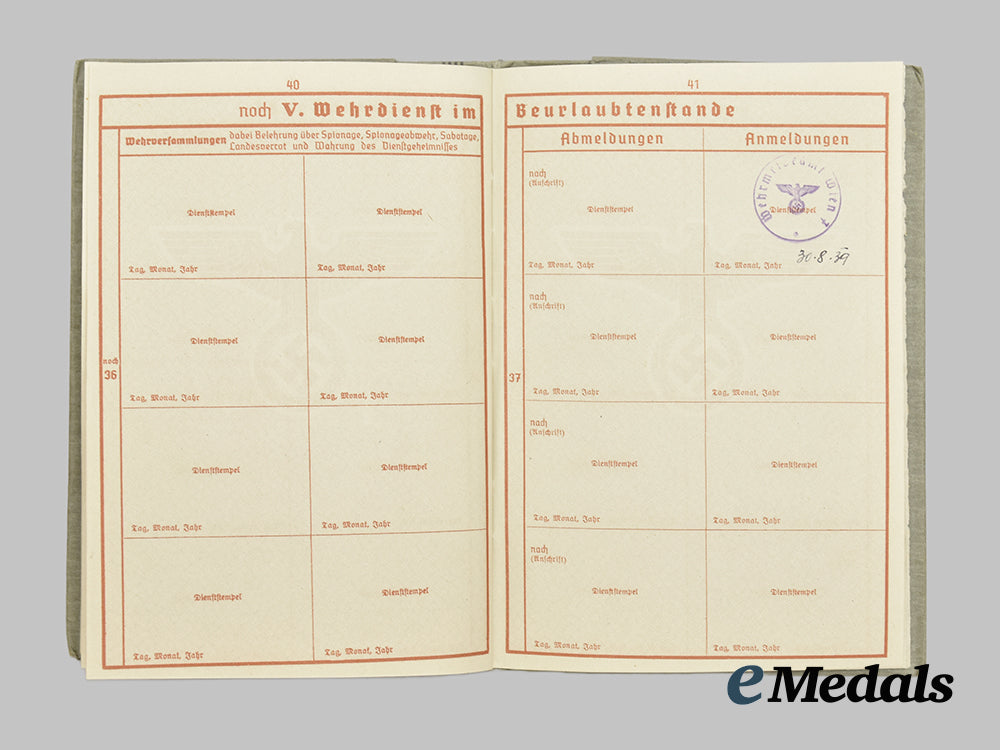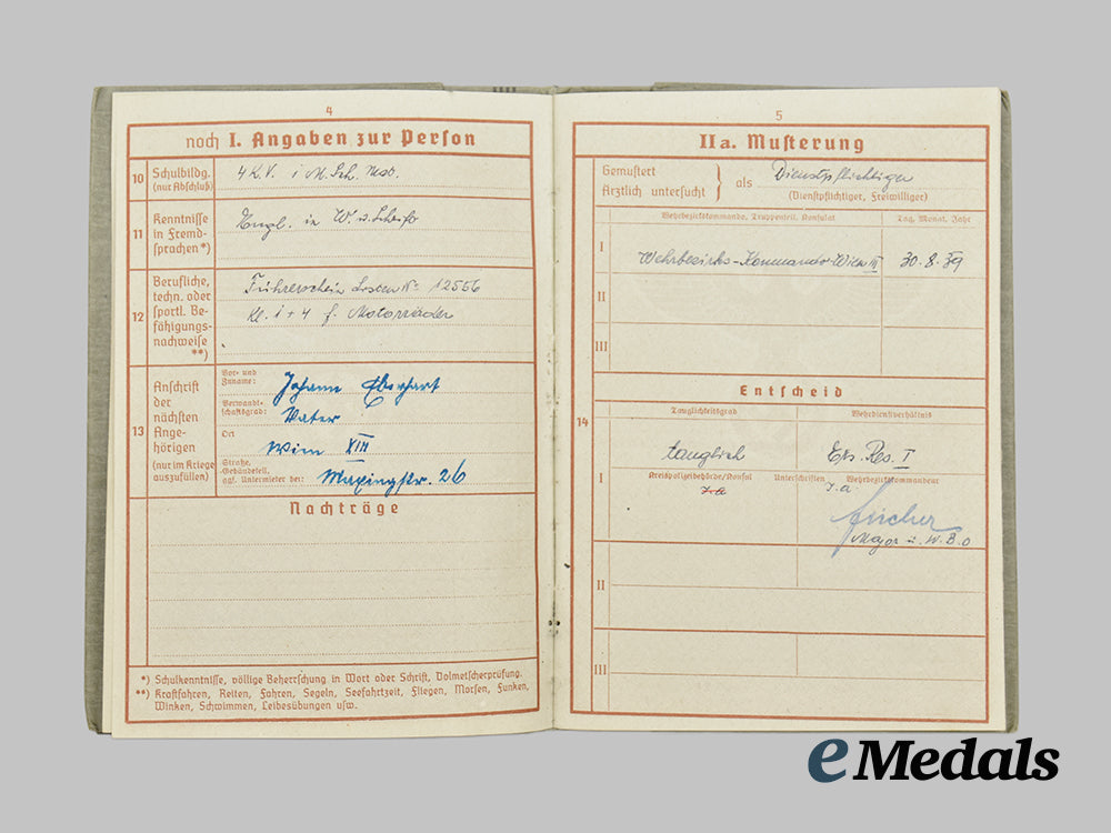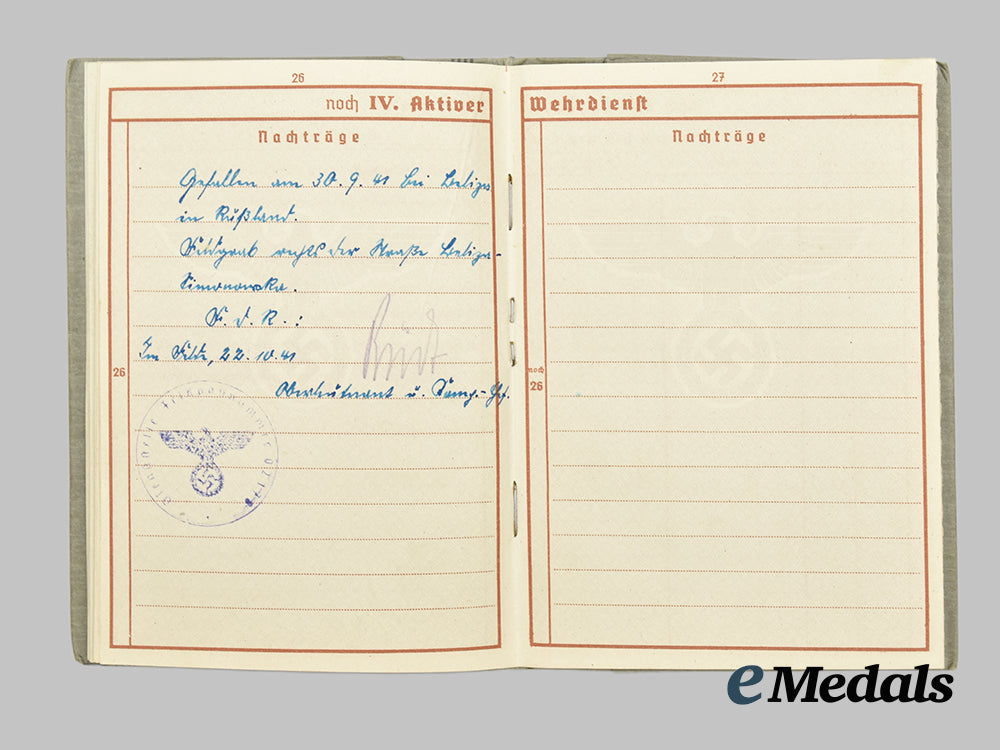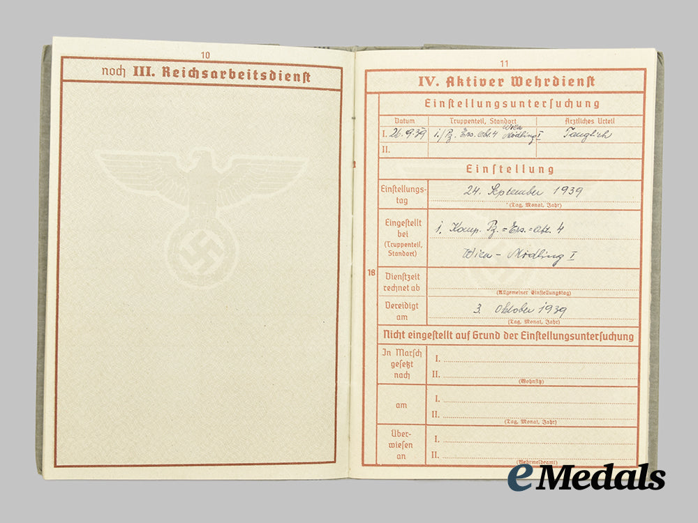 Before joining the Wehrmacht in summer of 1939 he had reached the HJ rank of Jungstammführer of Bann 506 (Wien-Schönbrunn, 6. Bezirk). He was first stationed at the 1. Kompanie Panzer Ersatz Abteilung 4 on September 24th, 1939, serving in the 7th Panzer Division, Regiment 18 at the time of his death. There are two pages towards the rear of the Wehrpaß that list the battles that Hans was part of.