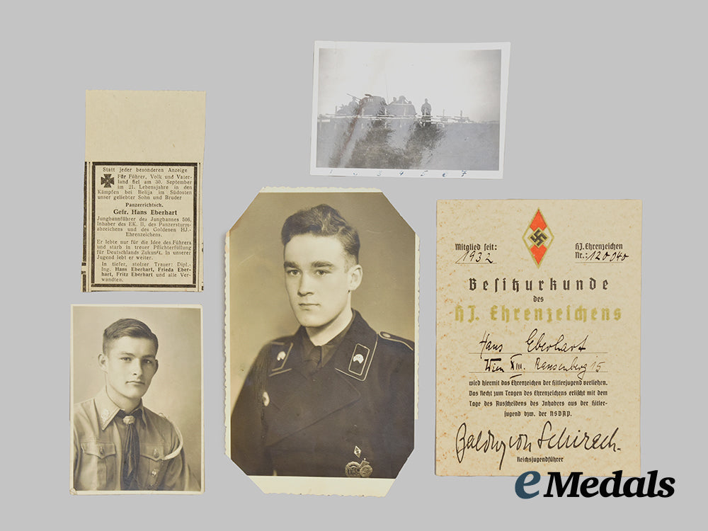 Accompanying this grouping is a photograph of Hans in his Wehrmacht Panzer uniform (rank of Gefreiter), also wearing his HJ Honour Badge, DRL Badge, and HJ Sports Badge, measuring 84 mm (w) x 134 mm (l).