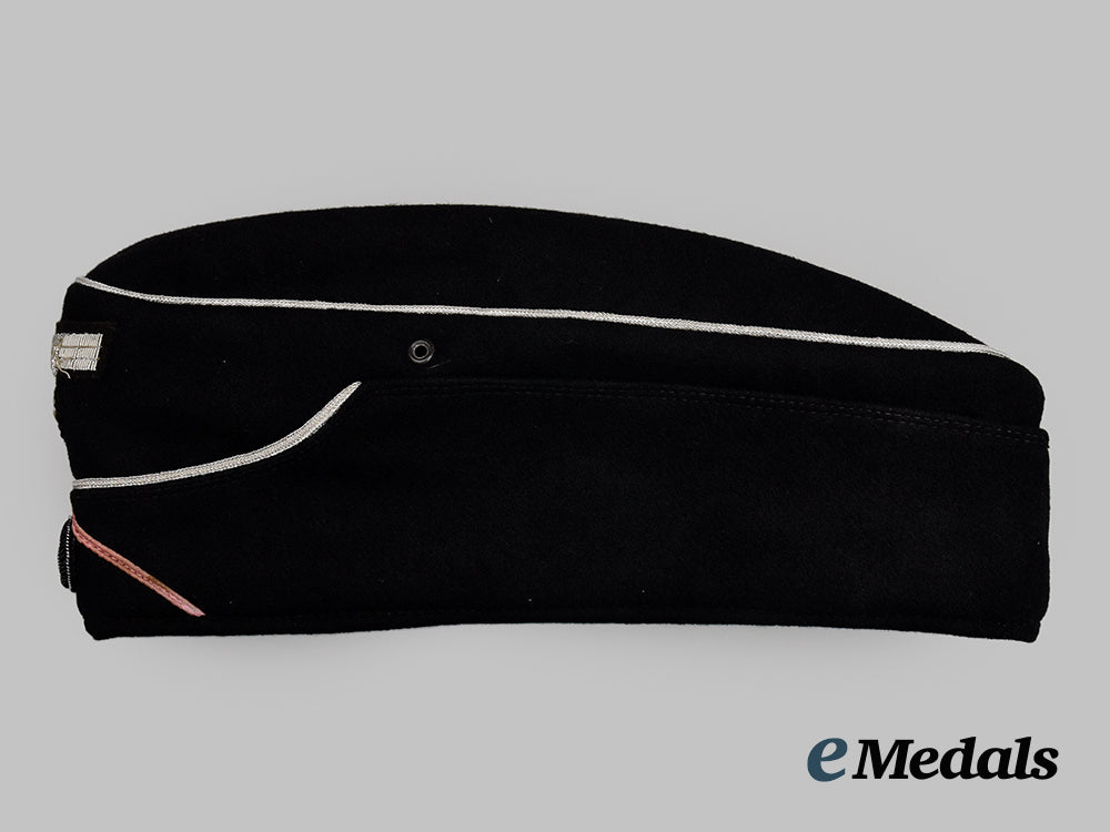 (Wehrmacht Schiffchen für Offiziere der Panzertruppe). An extremely well-preserved Heer Panzer Officer’s M38 overseas cap, constructed of black wool. The cap is fully surrounded by fold-down side walls which are scalloped toward the front. A length of silver aluminum wire piping trims the outer edge of the crown, while an additional length of identical piping extends across the peak. The crown is flanked by ventilation holes reinforced with black-painted non-magnetic metal grommets. Stitched onto the peak is an insignia consisting of a black wool backer bearing a hand-embroidered silver aluminum wire Wehrmacht eagle clutching a wreathed mobile swastika, measuring 72 mm (w) x 36 mm (h) overall. Directly below the eagle, the cap also retains a tri-colour cockade constructed of multi-coloured wire with a red wool centrepiece, measuring 24 mm in diameter. The cockade is surrounded by a classic rose-pink soutache. The interior is fully encompassed by a multi-piece black cotton liner, while a brown leather sweatband extends across the forehead. Stamped onto the right side is a maker’s mark of “G.A. HOFFMANN, BERLIN S.W. 29”, for the firm more widely noted for its Berolina trade name, above a manufacture date of “1940” and a size mark of “56”. The cap measures approximately 28 cm (l) x 13 cm (h) when folded on a flat surface. Demonstrating only minor soiling and fatigue, this high-quality example remains in an extremely fine condition.