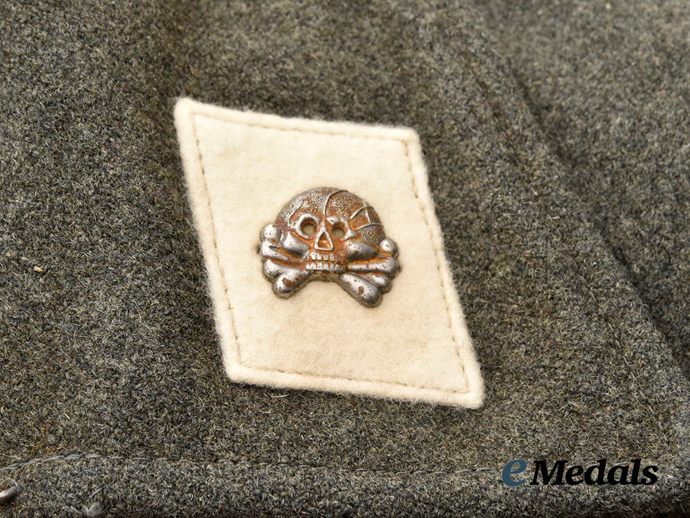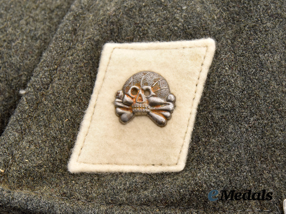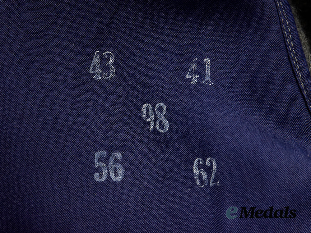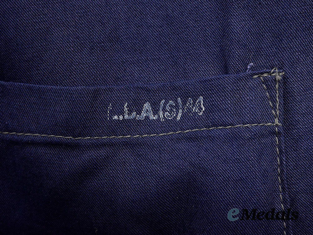 (Luftwaffe Sturmgeschützjacke für Mannschaften der Fallschirm-Panzer-Division 1. Hermann Göring). A well-preserved and late-war assault gun wrap issued to a member of the 1st Fallschirm-Panzer Division Hermann Göring, constructed of a field-grey wool cloth. It features a turned-down collar, transitioning into double breast lapels, which is flanked on each side by tabs. The former are constructed of white wool with buckram cores, are pinned with magnetic metal Danziger-style Totenkopf devices, and measure 40 mm (w) x 50 mm (l). The shoulders are topped by wool loops and pebbled zink buttons for the accommodation of straps which have been lost to time. A vertical slit is set into the cuff of each sleeve, and closes with two bakelite buttons for an adjustable fit. Stitched onto the upper right breast is an insignia consisting of a dark grey wool backer bearing a machine-embroidered silver-grey Luftwaffe eagle clutching a mobile swastika, measuring 100 mm (w) x 48 mm (h) and secured in place with factory-original zig-zag stitching. It closes with nine bakelite buttons on the right side meeting an array of hidden buttonholes on the left. The interior features a partial liner of multi-piece dark blue cotton construction, with a single pocket set into the right breast. Stamped onto the pocket is a Luftwaffenbekleidungsamt (Luftwaffe Clothing Depot) Sonneberg logo, flanked by a date of “44”, and topped by size dimensions. Straps inset with reinforced eyelets descend from the armpits for the addition of an optional belt hanger, while rayon straps emanating from the waist provide an internal belt. The wrap measures approximately 45 cm across the shoulders, with an arm length of 58 cm, and an overall body length of 58 cm. Minor material fatigue is visible to the base material, and the metal devices demonstrate some oxidation, but this late-war example, demonstrating the scarcity of wartime material, remains in a near extremely fine condition.