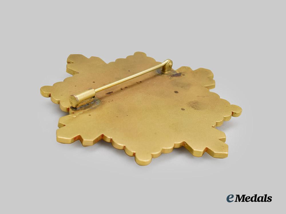 (Orden al Mérito) Type I. Instituted by Decree No. 8506/46 of 1946. Sash badge of the order, in solid bronze gilt, featuring a four armed multi-ray star with squared rays in each quadrant as well as red enamel finishes, obverse centre presenting figure carrying an enameled Argentinian flag, reverse centre also in enamels presenting the coat-of-arms, measuring 80.7 m (w) x 85.6 mm (h - inclusive of integral ring), with minor oxidisation, on original sash, very fine. Accompanied by the star of the order, flat construction in solid bronze gilt, a similar a four armed multi-ray star with squared rays in each quadrant as well as red enamel finishes, obverse centre presenting figure carrying an enameled Argentinian flag, reverse with horizontal pinback assembly, measuring 89.5 mm (w) x 89.5 mm (h), remains very fine.