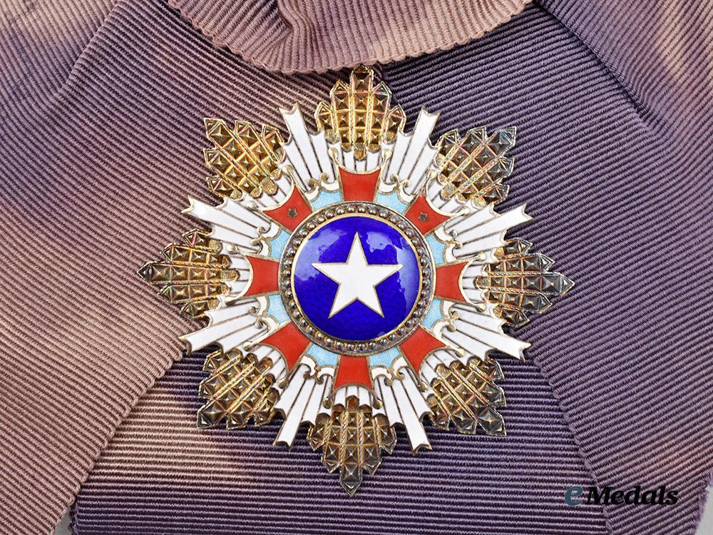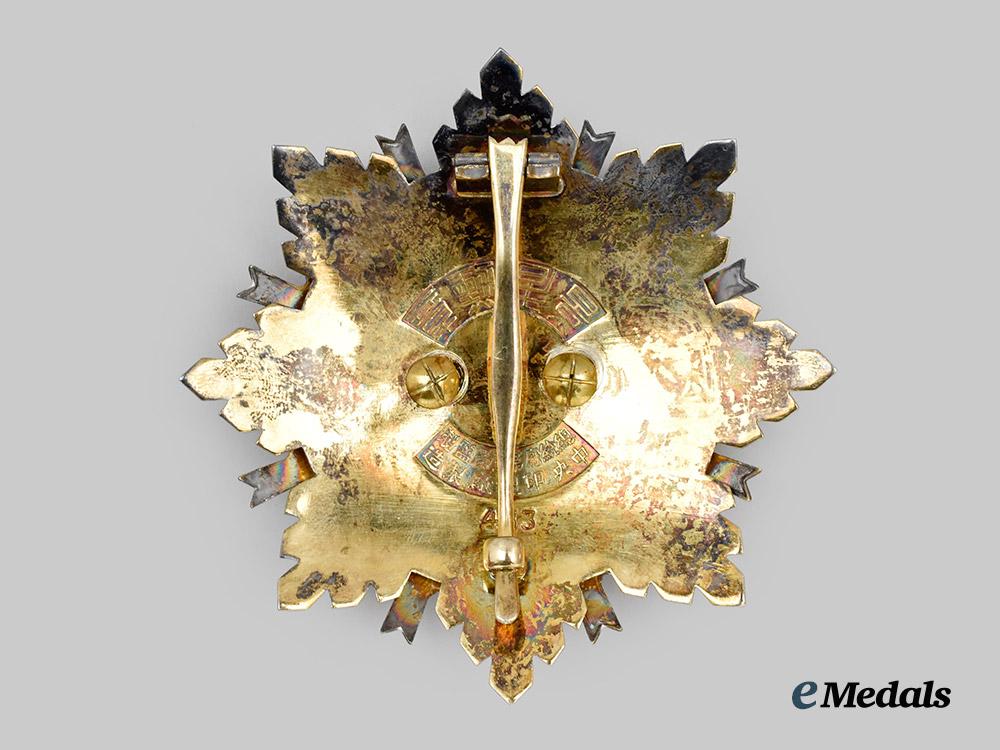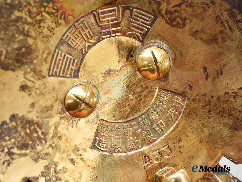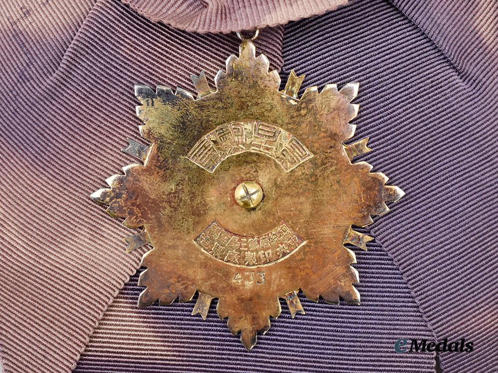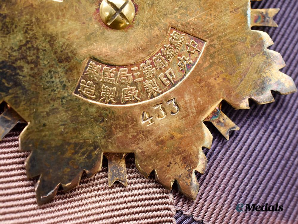 (Jǐng xīng Xūnzhāng). Instituted February 12th, 1941. Sash Badge of the order, in silver gilt consisting of an eight-pointed faceted multi-ray star, with a white enameled eight-pointed star, and an eight-pointed star of red enamels with dual ball finials on each, centre obverse presenting white star on blue enameled field, the reverse with similar Chinese characters and issue number “433”, measuring 72.9 mm (w) x 77 mm (h - inclusive of integral suspension), on original sash, better than extremely fine. Accompanied by the star of the order, in silver gilt, near identical in construction with multiple lawyers with brilliant star at centre, convex in design with reverse exhibiting central pin assembly as well as two fasteners, issue number above catch 433, measuring 89.8 mm (w) x 90.5 mm (h), 115.55 grams, toned silvering and also remains better than extremely fine.