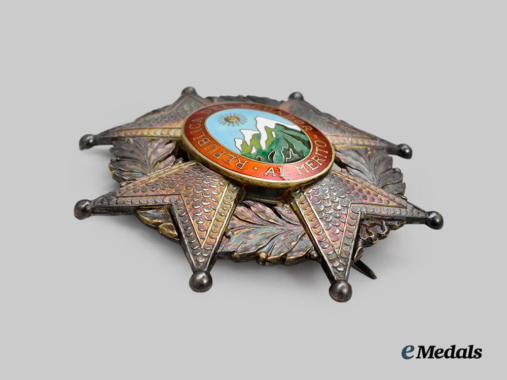 (Orden Nacional al Mérito). Instituted October 8, 1921. A Grand Cross Set, comprising a Sash Badge, in silver gilt, a twelve ray badge with red enamels, with segments of green enamel wreath weaving over and under alternating rays, the obverse medallion in silver gilt portraying three mountains with a smiling sun, the inscription reads REPUBLIC DEL ECUADOR AL MERITO, the reverse plain, 55.75 mm (w) x 60.88 mm (h), weighs 114.35 grams (including ribbon), worn on a full length sash in yellow, blue and beige silk, a lovely decoration though missing the wreath suspension, extremely small enamel chip to the 4 o’clock ray, dark patina in the center, remains in very fine condition.