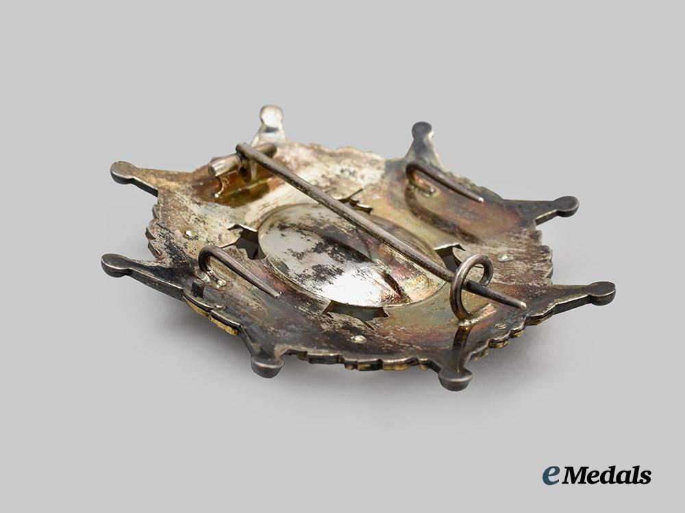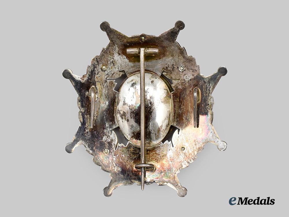 The Star of the Order, presenting a silver Maltese cross with scaled arms and ball finials, segments of wreath in each quadrant and between the knees of the arms, the obverse oval medallion in multi-coloured enamels presenting snow capped green mountains with a blue sky and gilt sun, the reverse of the star with a raised barrel hinge, vertical round wire pinback, and rightward-facing round wire catch, with two downward-pointing stays for secure attachment to an uniform, unmarked, measuring 69.45 mm (w) x 73.93 mm (h), weighs 68.42 grams, enamels intact, heavy gilt loss and oxidation to star, in very fine condition.