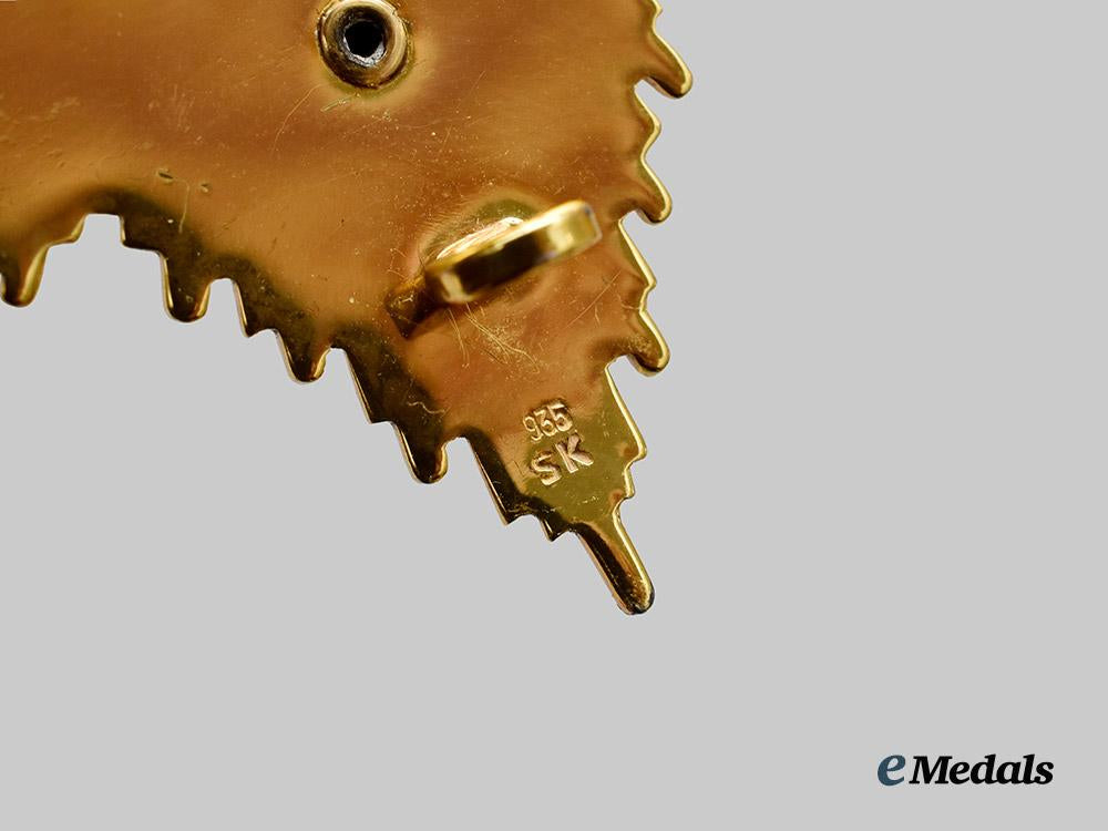 (Verdienstorden der Bundesrepublik Deutschland, or Bundesverdienstorden). Instituted 1951. Special Class of the Grand Cross reserved for Heads of State; Badge of the order featuring a four armed cross in silver gilt with red enamels, both obverse and reverse centre presenting a black enameled Federal eagle, with fan suspension, measuring 71.6 mm (w) x 81.6 mm (h - inclusive of suspension), 33.66 grams, on original sash which features embroidered eagles throughout, extremely fine. Accompanied by a six pointed star with multiple rays in silver gilt with centre obverse presenting a red enameled cross featuring a federal eagle in black enamel, reverse missing pin back, measuring 69.8 mm (w) x 80.9 mm (h), marked on reverse 6 o'clock arm 925 and SK, intact enamels, remains near very fine.