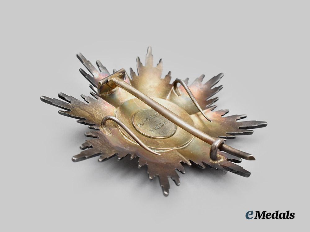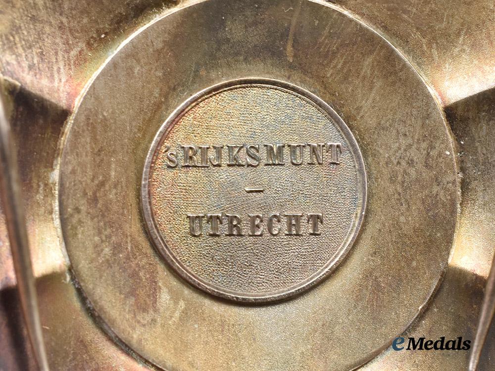 Accompanied by the Star of the Order, an eight point silver star with clusters of smooth rays, the obverse medallion featuring the rampant crowned lion with sword on a blue field, encircled by a white ring inscribed JE MAINTIENDRAI, the reverse with a vertical pin assembly flanked by dual stays, the reverse cartouche marked ‘sRIJKSMUNT UTRECHT, measures 82.30 mm (w) x 84.35 mm (h), 66.94 grams, one ray bent at 3 o’clock, dark patina, enamels intact, remains in extremely fine condition.