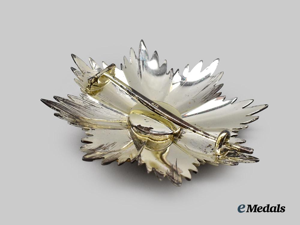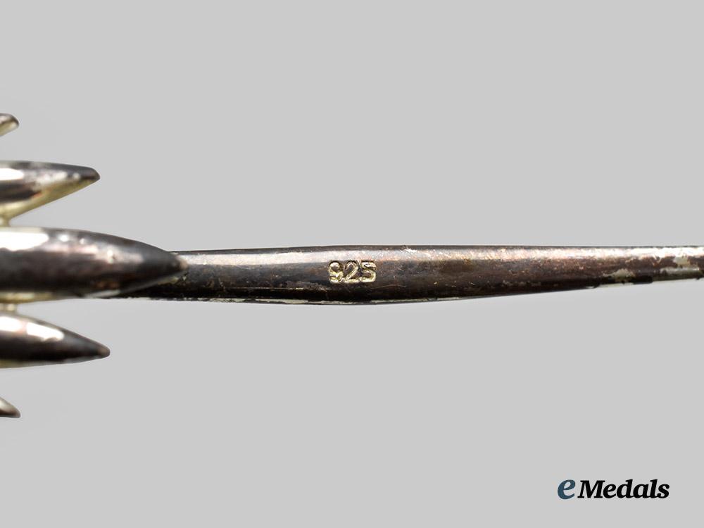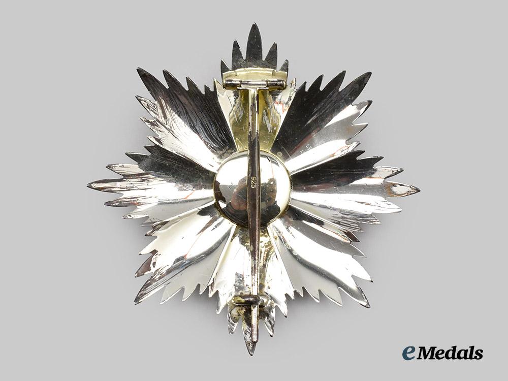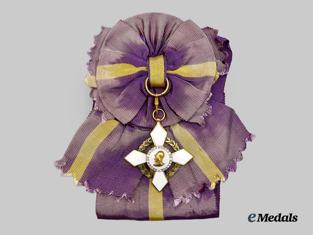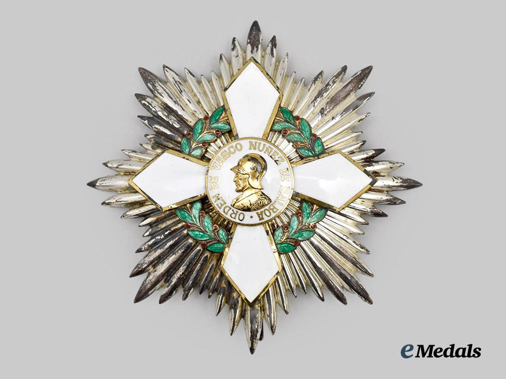 (Orden de Vasco Nuñez de Balboa). Instituted 1937. 1937 - Present Issue. Sash badge of the order, featuring in bronze gilt consisting of an enamelled white four-armed cross, surrounded by a detailed laurel wreath in green enamels, centre depicting a superposed bronze gilded bust of Vasco Nuñez de Balboa surrounded by the inscription ORDER OF VASCO NUÑEZ DE BALBOA on a white enamelled background, the reverse with embossed centre, measuring 57.3 mm (w) x 62 mm (h - inclusive of suspenion), on original sash, extremely fine. Accompanied by a fine eight-armed star in silver, composed of multiple rays, obverse centrepiece in bronze gilt consisting of an enamelled white four-armed cross, surrounded by a detailed laurel wreath in green enamels, centre depicting a superposed bronze gilded bust of Vasco Nuñez de Balboa surrounded by the inscription ORDER OF VASCO NUÑEZ DE BALBOA on a white enamelled background, the reverse with pin assembly, silver hallmark denoting fineness of 925, measuring 81.1mm (w) x 81.0mm (h), with toning to obverse, extremely fine.