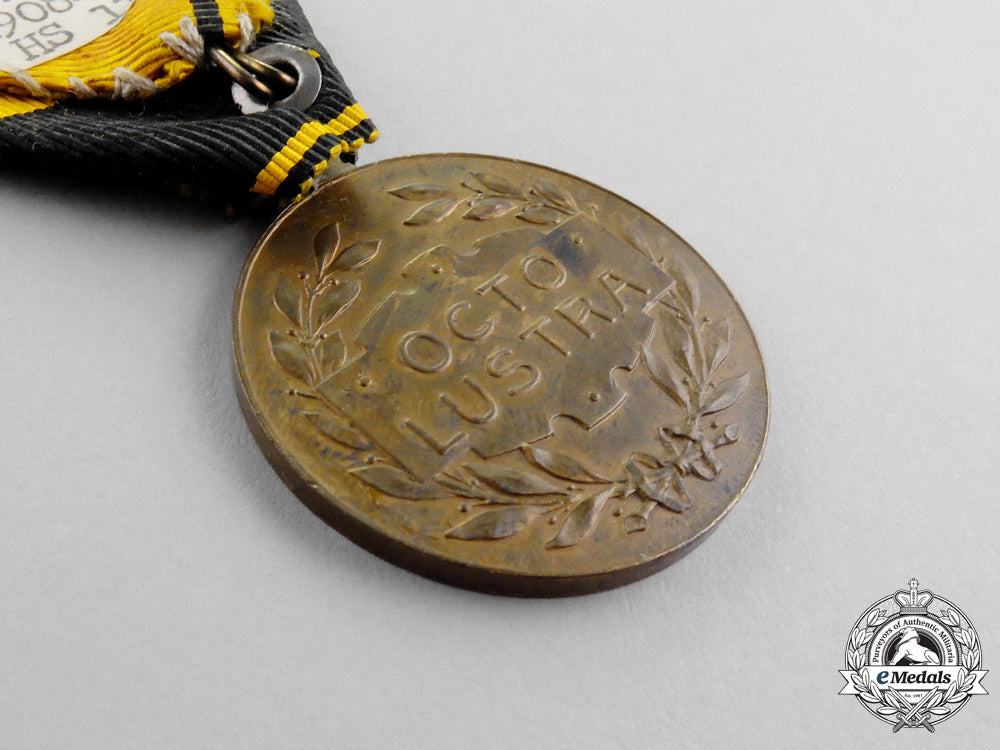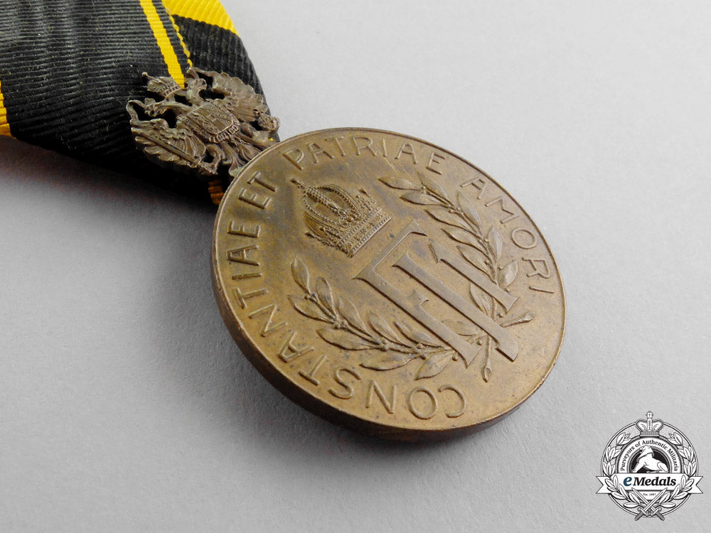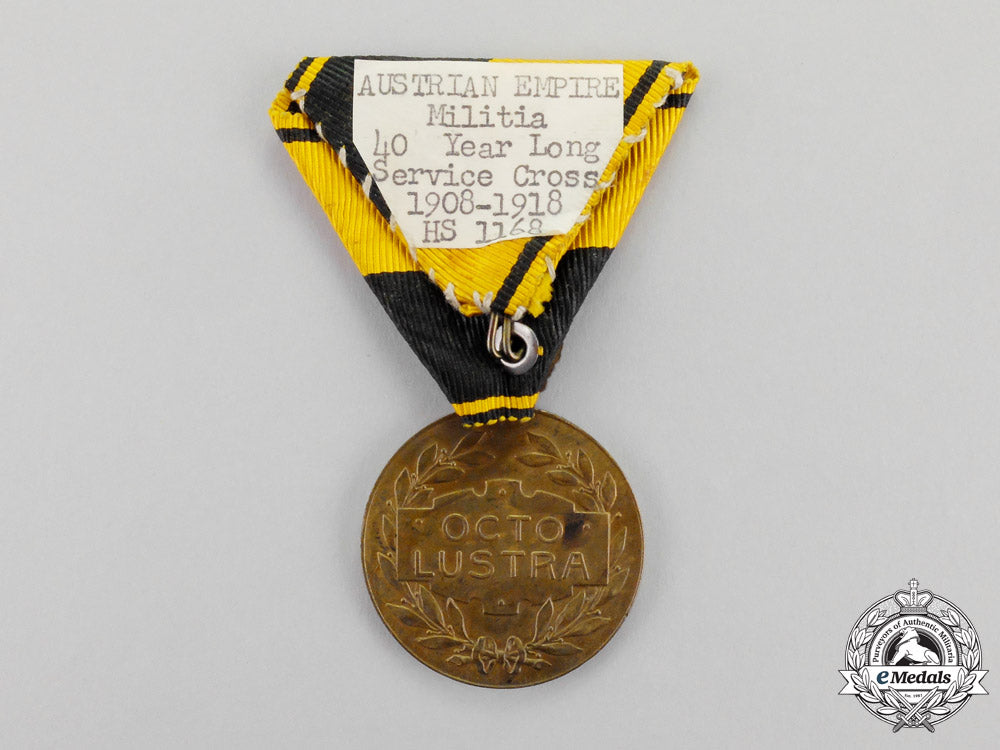 A Militärdienstzeichen for 40 Years of Service in the Austrian Militia, a round bronze gilt medal, the obverse inscribed “FJ1” topped by a crown and with laurel bunches at the base, circumscribed “Constantiae Patriae Amori” (Latin - Consistency and Love for Country), the medal topped by a double headed crowned Imperial eagle, the reverse inscribed “Octo Lustra” (Latin - 38) within a laurel wreath, on a loop for suspension with its period original tri-fold ribbon, measuring 34.94 mm in diameter, weighing 25.4 grams, a worn example, in overall better than very fine condition.