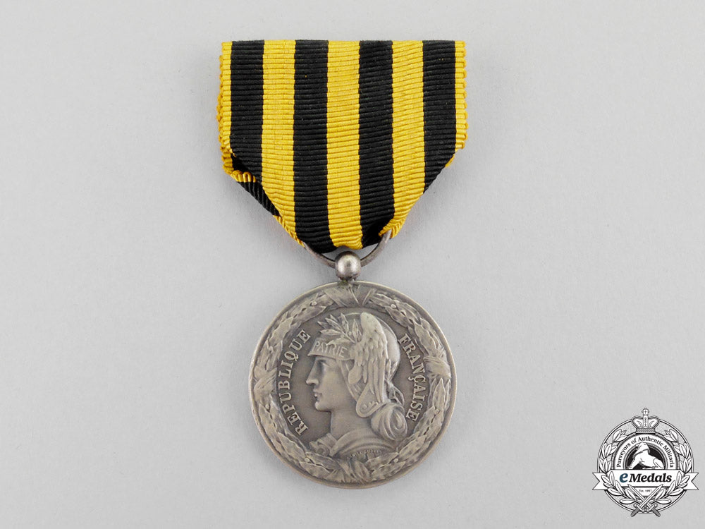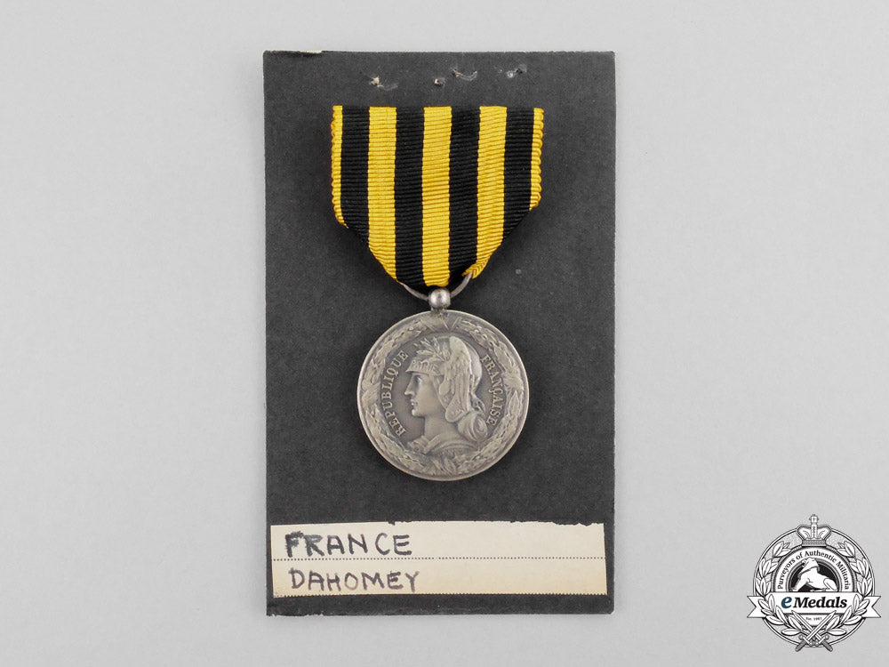 Footnote: The Dahomey Expedition Commemorative Medal was bestowed upon the participants of the First Franco-Dahomean War (1890) and of the Second Franco-Dahomean War (1892-1894), to commemorate their feats of arms. In 1892, France decided to send an expeditionary force of 1,801 Europeans and 1,769 natives under the command of Marine Infantry Colonel Alfred Dodds, in response to the harassment of the kingdom of Porto-Novo under its protectorate and its trading posts on the coast of Dahomey by the troops of Behanzin, the King of Abomey. The troops taking part in this expedition, which lasted five months, defeated the 12,000 warrior strong army (including the 2,000 women strong Corps of amazons) of Behanzin at Dogba. France thus reconquered the Kingdom of Dahomey (now the Republic of Benin) and placed at its head, Toffa as the King of Porto-Novo. King Behanzin was captured in 1893 and deported to Martinique then to Algiers where he died in 1906. The Law of November 24, 1892 instituted the medal for award to the officers, sailors and soldiers who took part in this campaign.