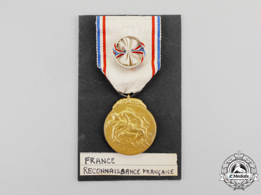 Footnote: The Medal of French Gratitude was a French honour medal created on July 13, 1917 and solely awarded to civilians. The medal was created to express gratitude by the French government to all those who, without legal or military obligation, had come to the aid of the injured, disabled, refugees, or who had performed an act of exceptional dedication in the presence of the enemy during the First World War. The creation of this distinction was mainly the result of unsuccessful offensives of General Nivelle in 1917 and the serious crisis of confidence in France. The French government thus wanted to thank those who, despite the crisis, were always volunteering. It was awarded following the First World War to: Persons who, in the presence of the enemy, have performed acts of exceptional dedication, the duration of these services having spanned one year (Decree of December 2, 1917); Deserving communities (whose members were are not allowed to wear the ribbon or individual medal by decree of December 2, 1917); Citizens of Alsace and Lorraine who were deported, exiled or imprisoned, before August 1, 1914, by German authorities because of their attachment to France and those in the departments occupied themselves, for their courageous stand while exposed to reprisals (Decree of 1 April 1922); and Prisoners of war, civilian prisoners, hostages and deportees because of exceptional acts courage and dedication for the allied cause. The inhabitants of occupied areas or Alsace and Lorraine who helped these people (decrees of 29 November 1926 and December 8, 1928). It came in three grades: Gold, Silver and Bronze; in two versions: Type I by Jules Desbois and Type II by Maurice Delannoy. Nearly 15,000 people and communities were recipients of this award. The medal is no longer awarded, the last award issued on February 14, 1959."