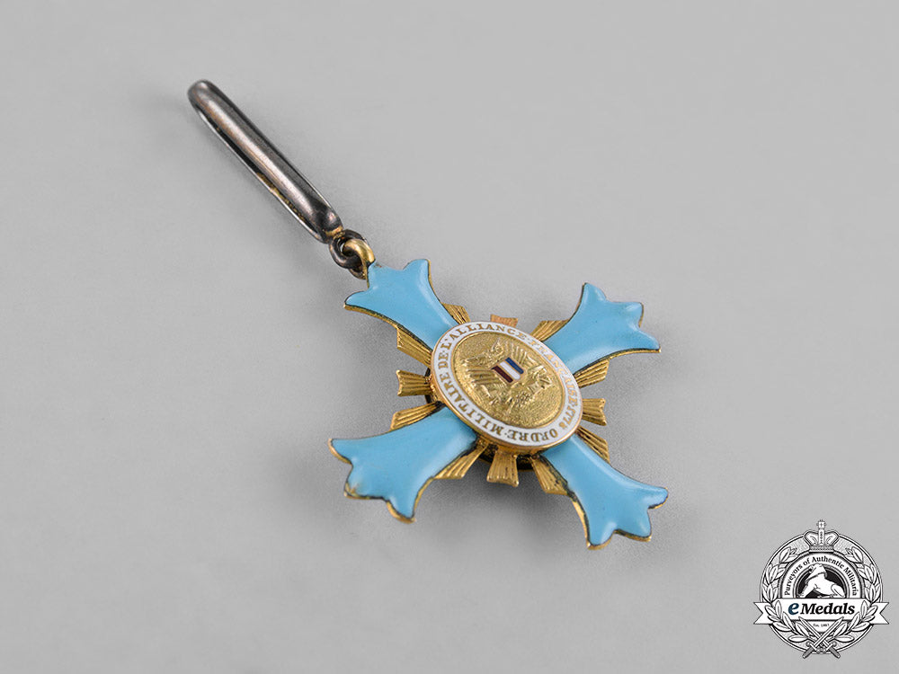 (Ordre Militaire de ‘Alliance Française, commandeur) Pale blue enamel cross bottony with three gilt ribbed rays between each arm, on loop and ribbon ring suspension; the face with an oval medallion imposed centrally, a gilt stippled ground bearing an escutcheon with black, white and black enamel vertical panels, an eagle above with wings spread, all on a trophy of arms in relief and encircled by a gilt-edged white enamel ring inscribed in gilt letters ‘ORDRE MILITAIRE DE L’ALLIANCE FRANÇAISE 1778’; the reverse with an oval medallion imposed centrally, a gilt stippled ground bearing a pastiche of Mount Rushmore encircled by a gilt-edged white enamel belt inscribed in gilt letters ‘L’UNION RENFORCE LA VALEUR’ (Unity reinforces bravery); a small chip to the blue enamel of the left-hand tip of the face; 39.5mm (1.55 inches) wide, 42.50 mm (1.67 inches) high; on neck ribbon, very fine.