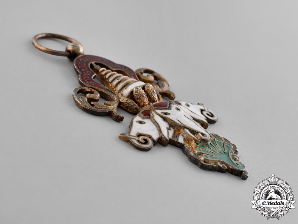 (Lan Xang Hom Khao). Instituted 1909. An early and large French manufactured example in silver gilt, obverse with the characteristic Laos tri-elephant design in white and red enamels, seven layered crown with red enameled ribbon suspension, measuring 38.2 mm (w) x 66 mm (h - inclusive of horizontally pierced ball suspension), hallmarked on ring with unknown French maker FR with arrow in diamond, with minor enamel loss, near very fine.