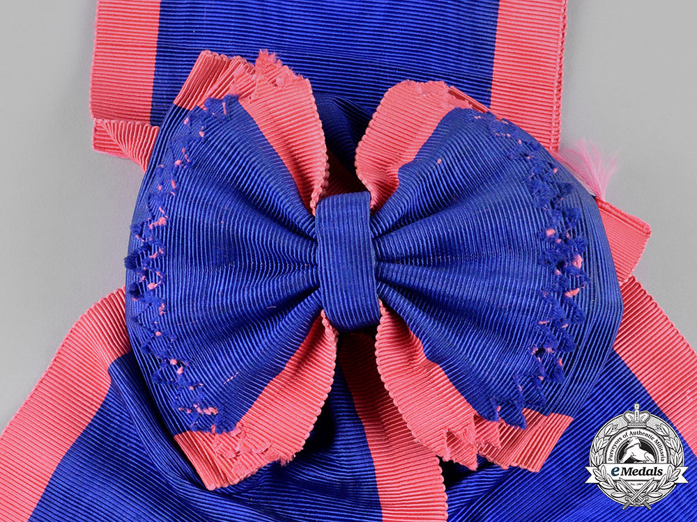 (Königlicher Verdienstorden vom hl. Michael). Instituted in 1837. An early 20th Century Sash section, fabricated from silk, incorporating a decorative moiré pattern, with a wide royal blue field flanked by pinkish-red stripes on either side, a large bow-tied rosette sewn in place near the bottom end for the placement of the badge, measuring 101 mm wide x 315 mm in length, vibrant colours, intact stitching, extremely fine.