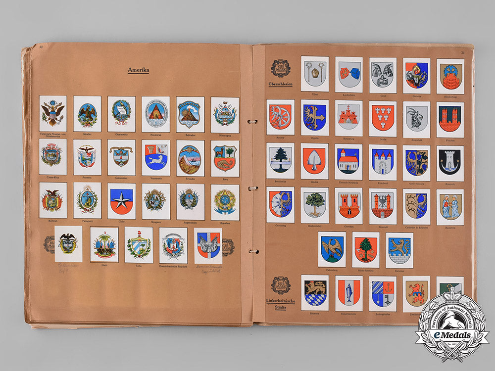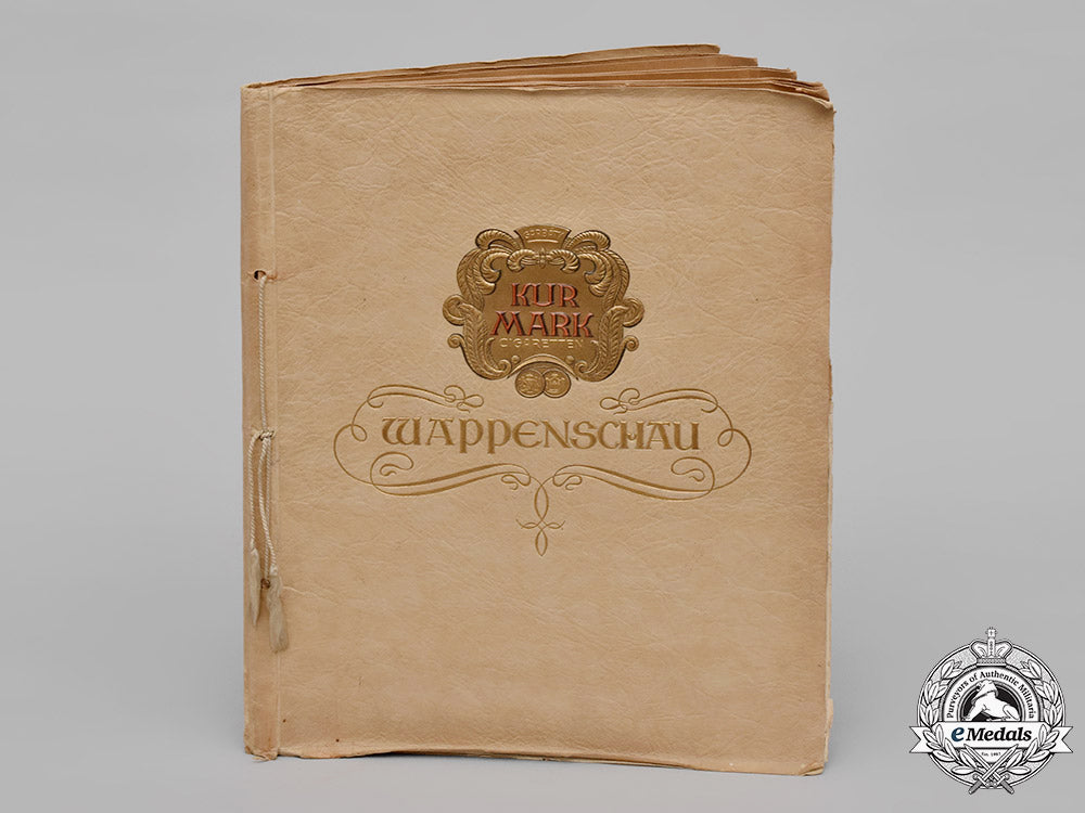 (Wappenschau). A softcover scrapbook by Kurmark Cigarette Factory, titled WAPPENSCHAU (COAT OF ARMS SHOW), containing 32 pages presenting over 1,000 cigarette cards, measuring 29 cm (w) x 35.7 cm (h), presenting moderate tearing and scuffing along outer edges, cigarette cards undamaged, and in overall very fine condition.