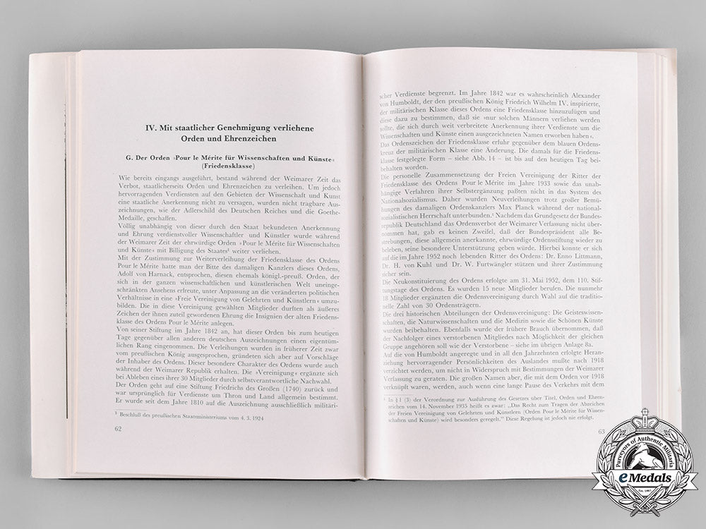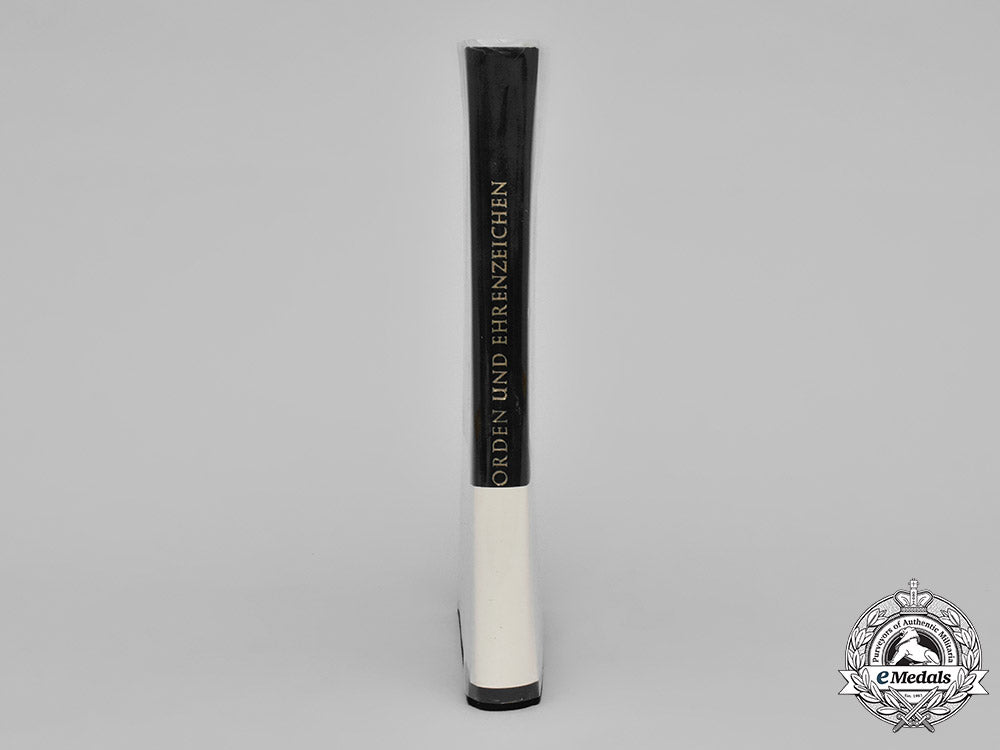 (Orden und Ehrenzeichen der Bundesrepublik Deutschland). Orden und Ehrenzeichen der Bundesrepublik Deutschland (Orders and Decorations of the Federal Republic of Germany), by Hans-Ulrich Krantz, published in Kölns and Herford in 1958 by Maximilian-Verlag, with cloth cover in black presenting a red and gold design, with clear plastic slipcover, containing 260 pages, including colour illustrations and black-and-white photographs, measuring 17.3 cm (w) x 24.2 cm (h), and in extremely fine condition.