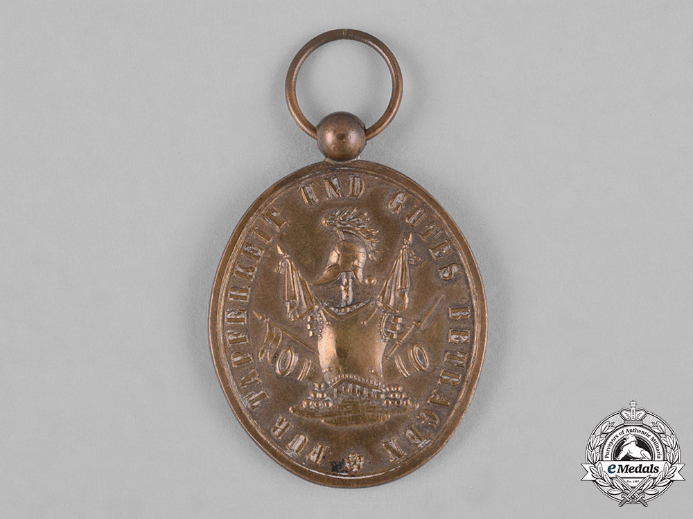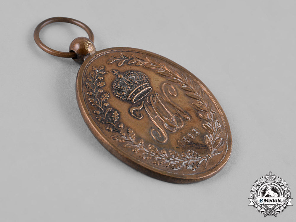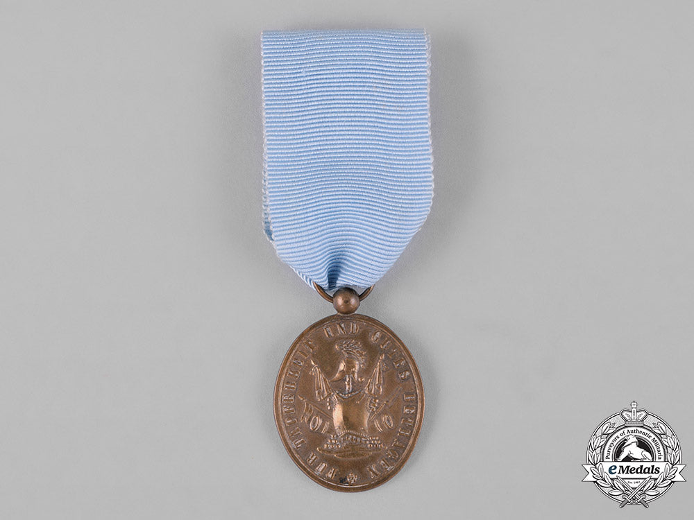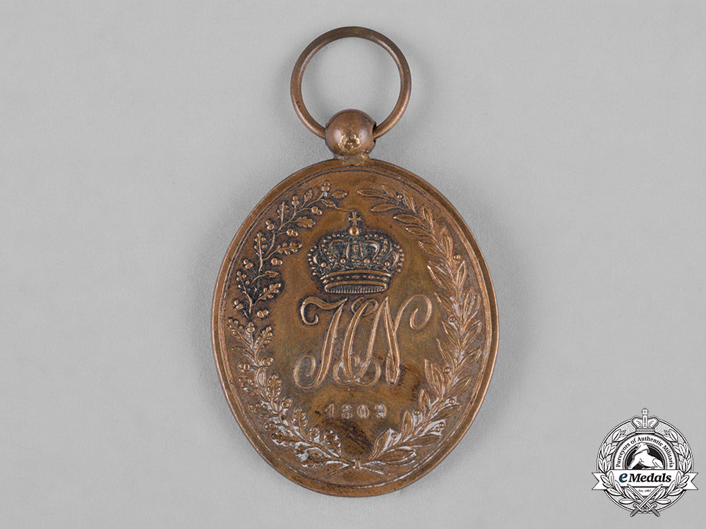 Ehrenmedaille. Instituted in 1809. In bronze, obverse illustrating 6 and 7 cannonballs flanking the base of the trophy of arms, the particular number of cannonballs designating it as the unofficial type III version, surrounded by the inscription "FÜR TAPFERKEIT UND GUTES BETRAGEN", reverse illustrating the intertwined letters "HN" surmounted by a crown forming the royal cypher, the date "1809" below, within an open-ended wreath formed by a branch of oak leaves and acorns on the left and laurel leaves on the right, measuring 33 mm (w) x 44.7 mm (h) inclusive of its laterally-pierced ball suspension, spotting on the obverse, residue in the recessed areas of the reverse from cleaning, ball suspension period repair, good/fine.