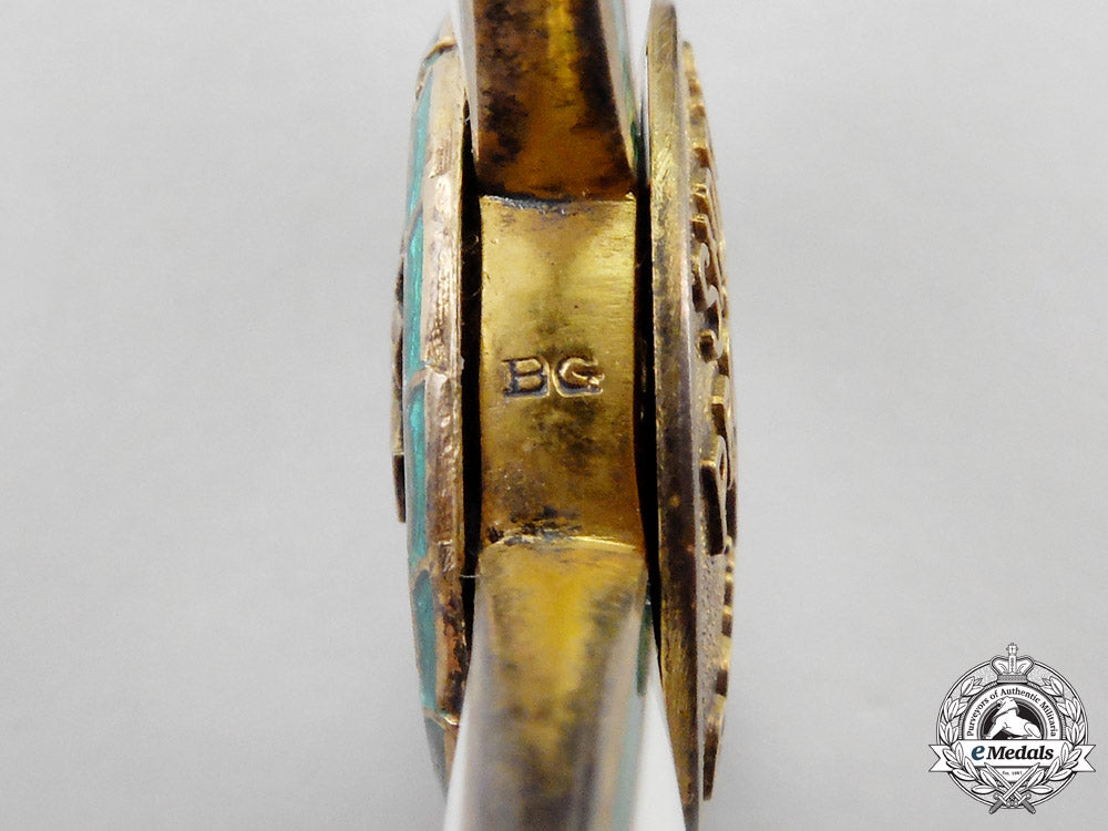 Hungary (Kingdom); Multi-piece construction, silver gilt with red, white and green enamels, unmarked, 53 mm, on its original full-length neck ribbon, intact enamels, extremely fine.