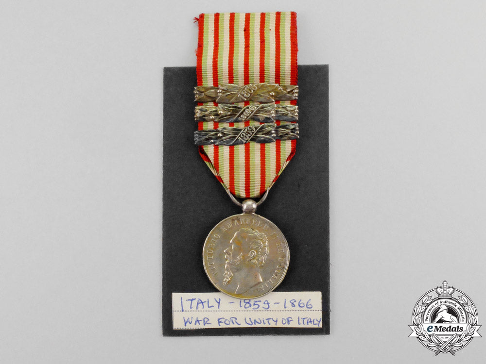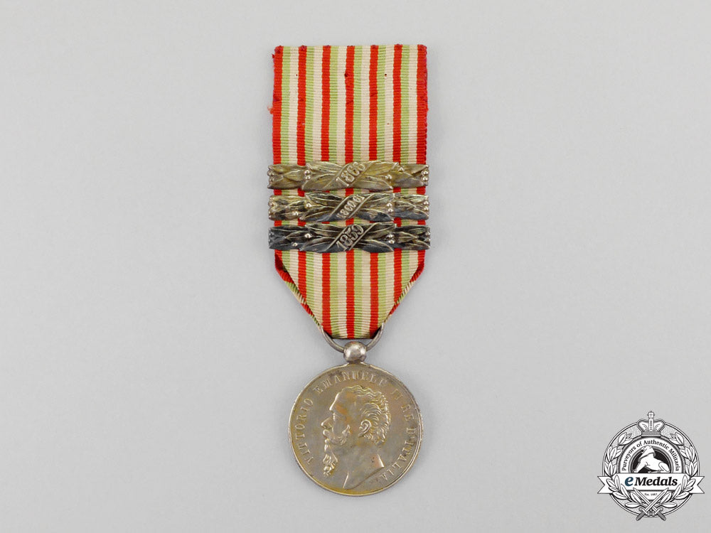 In silver, unmarked version, measuring 32.5 mm, three clasps on its original ribbon, the clasps dated ""1859"" (War with Austria), ""1860-61"" (Garibaldi's Expeditions) and ""1866"" (War with Austria), lacquered medal and clasps, contact marks, very fine.