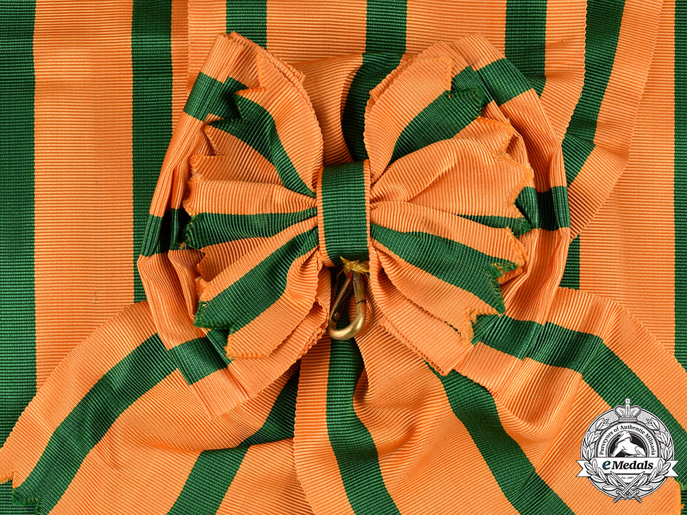 (Ordre de la Couronne de Chene). Instituted in 1841. A mind 20th Century Sash fabricated from silk, incorporating a decorative moiré pattern, with a pale yellow field throughout and incorporating three green stripes, one in the center and one on either side of the centre stripe, a large bow-tie with a brass loop sewn in place near the bottom end for the placement of the badge, measuring 100 mm wide x 770 mm in length, vibrant colours, intact stitching, extremely fine.