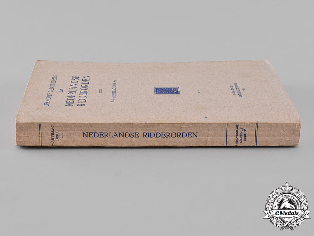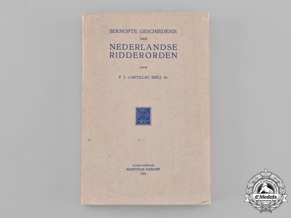 (Beknopte Geschiedenis der Nederlandse Ridderorden). Beknopte Geschiedenis der Nederlandse Ridderorden (Brief History of the Dutch Knight Orders), by P.J. D'Artillac Brill Sr., published by Martinus Nijhoff in 1951 in ‘s-Gravenhage, constructed of a sewn grey paperback binding, containing 204 pages, including illustrations, measuring 15.8 cm (w) x 24.1 cm (h), presenting some damage to interior pages, in otherwise very fine condition.