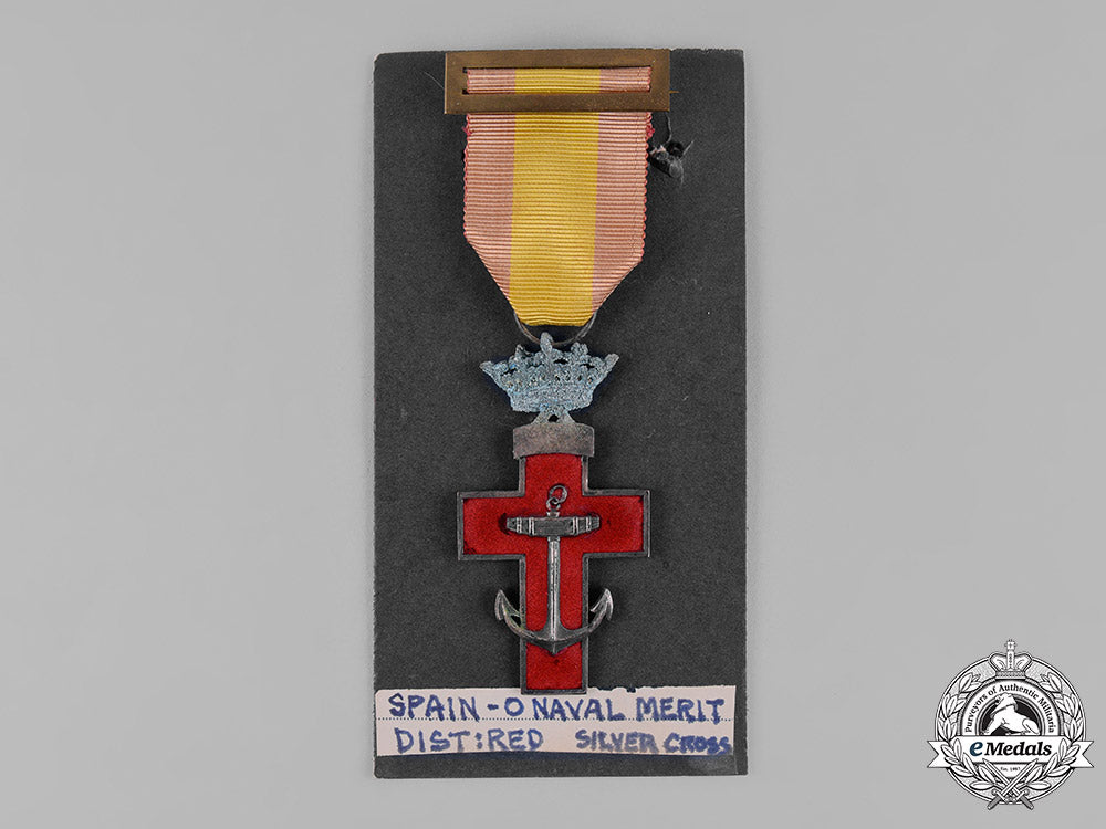 (Orden al Mérito Naval). Instituted on 3 August 1866. Type VI with Mural Crown. (1931-1939 Issue). A red enamelled Latin cross in silver, obverse centre exhibiting a silver anchor, reverse plain, adorned by a Mural crown in bronze gilt, measuring 32.33 mm (w) x 61.49 mm (h - inclusive of the imperial crown), presenting heavy oxidation on the crown, on loop for suspension from period original ribbon with a traditional Spanish-style horizontal hanger with pinback, and in fair condition.