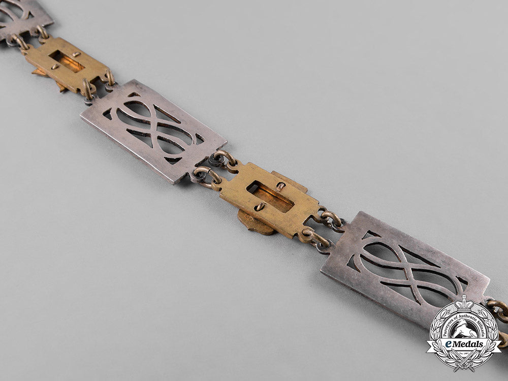 (Orden de la Cruz de San Raimundo de Peñafort). Instituted 1944 by General Francisco Franco. 1944-present issue. A rare sample of twenty-two links counting ten unbodied silver ornamented squares with laces, alternating with six superposed enameled blue and red figure of St. Peñafort, completed by five superposed enameled white and red symbol of the Spanish justice inscribed by the Latin inscription JUSTITIA (Justice) both in bronze gilt, with a palm wreath central link connecting the ends, plain reverse, measuring 410 mm length, presenting oxidation on the links, good.